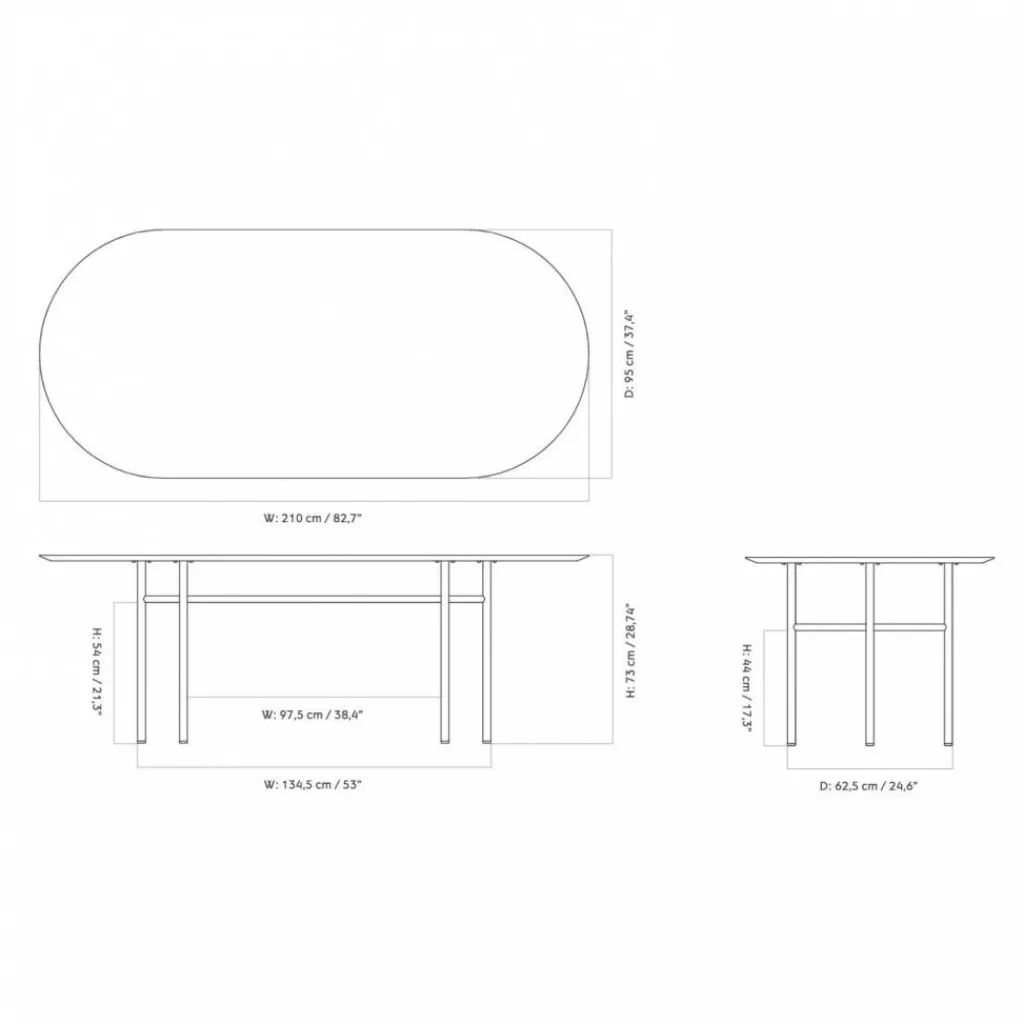 Der Snaregade Esstisch oval wiegt 61 kg. Die Länge beträgt 210 cm und die Breite 95 cm. Der 73 cm hohe Tisch harmoniert besonders gut mit Möblierung im schlichten nordischen Stil.