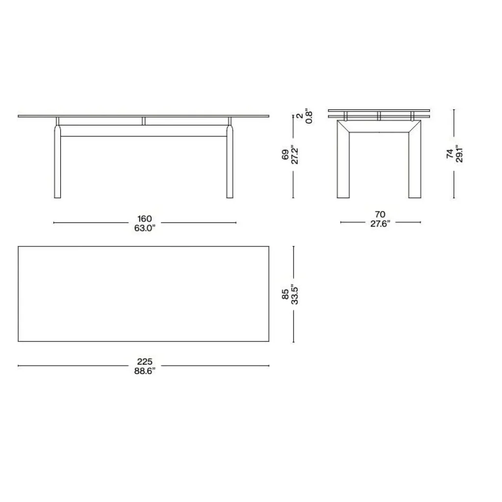 Der Le Corbusier LC6 Tisch macht im Wohn- oder Esszimmer eine gute Figur. Er wird in eleganten Büros auch gerne als Konferenztisch eingesetzt. Der moderne Tisch ist 225 cm lang. Die Breite beträgt 85 cm und die Höhe 74 cm.