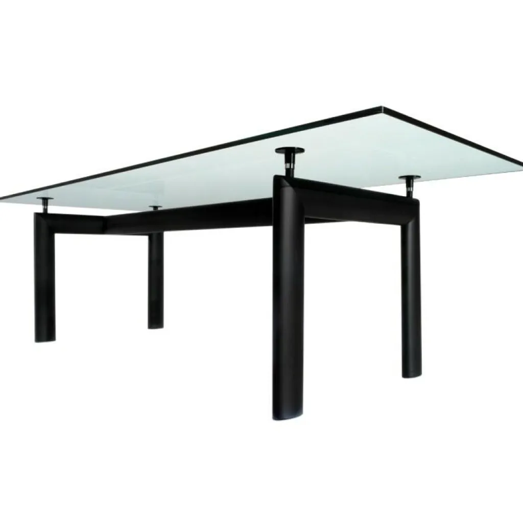 Der Le Corbusier LC6 Tisch entstand 1928 und wurde ein Jahr später bei der renommierten Ausstellung des Salon d’Autumne in Paris vorgestellt. Das Modell sorgt für Furore: Die Designer setzen ihren Vorsatz nämlich perfekt um, das tragende Element von der Tischplatte optisch zu trennen. Sie sind in der Tat nur mit filigranen Stützen verbunden. Die Idee dafür schauten sich die Designer von der Luftfahrt an, wo die Flügel von Doppeldeckern in ähnlicher Manier getrennt werden. Das in verschiedenen Farben erhältliche Gestell besteht aus Stahl. Die transparente Tischplatte wird aus Kristallglas hergestellt. Sie verleiht dem Le Corbusier LC6 Tisch ein edles Erscheinungsbild. Die Tischplatte ragt deutlich über den Rahmen hinaus.