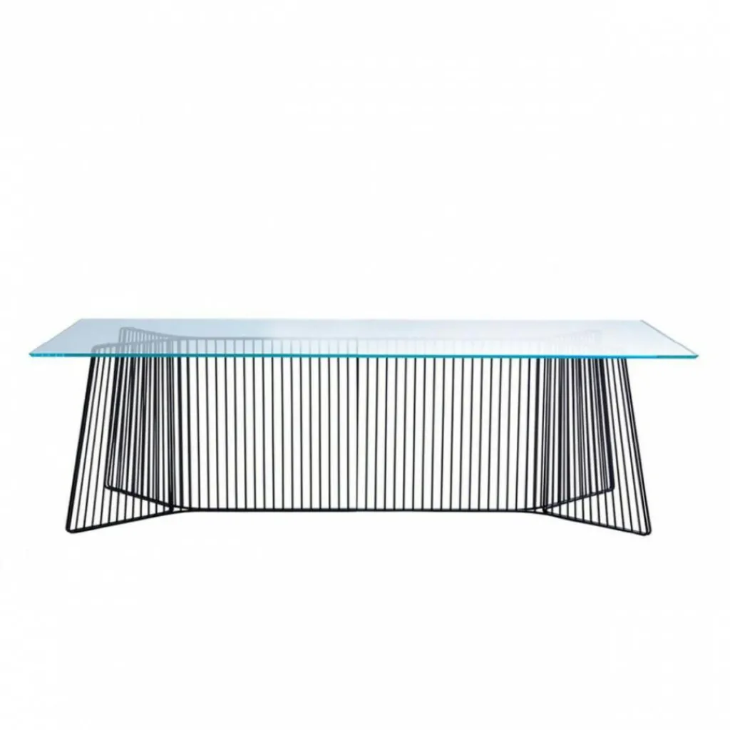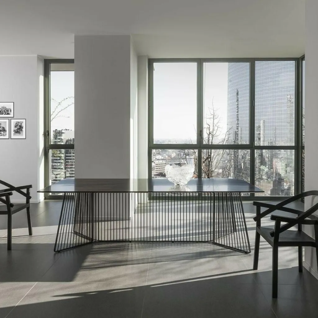 Ein bestimmendes Merkmal ist dabei die unkonventionelle Formen- und Materialkombination. Der Anapo Esstisch besteht aus Stahl und Glas. Dabei kommen hier keine herkömmlichen Tischbeine zum Einsatz. Stattdessen ruht die elegante gläserne Tischplatte auf einem stählernen Gittergestell, dass die Transparenz des Designs noch mehr unterstreicht. Auf diesem Tisch von Gordon Guillaumier zu sitzen, wird immer wieder zum Erlebnis. Mit seinen großzügigen Maßen von 250 x 105 x 74 cm strahlt er dabei jederzeit Ruhe, Größe und Funktionalität aus. Mit diesen Eigenschaften kann der Anapo Esstisch von Gordon Guillaumier nicht nur in privaten, sondern auch in geschäftlich genutzten Räumen zum Einsatz kommen.