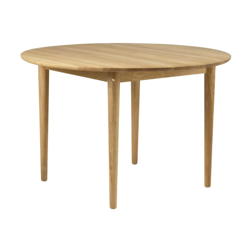Mit seiner großzügigen kreisrunden Tischplatte lädt der C62 Bjørk Esstisch nicht nur zum gemeinsamen Einnehmen von Mahlzeiten mit der Familie zu Hause ein, sondern bietet auch Platz für gesellige Runden mit Freunden oder konstruktive Gespräche im Büro. Unter der Oberfläche, die mit ihren sanft gerundeten Kanten und dem geölten Finish eine angenehme Haptik verspricht, überrascht der Designtisch mit einer platzsparenden quadratischen Konstruktion. Ein kantiger Rahmen, der in gerade Beine mit rundem Querschnitt eingespannt ist, bietet eine hohe Stabilität, während die konische Form der Tischbeine sowie ihr runder Abschluss dem Möbel eine leichte Optik schenken. Hergestellt aus nachhaltig gewonnenem Eichenholz bringt der C62 Bjørk Esstisch einen natürlichen Look ins Esszimmer, in die modern designte Betriebskantine oder die Kaffeeküche im Büro.