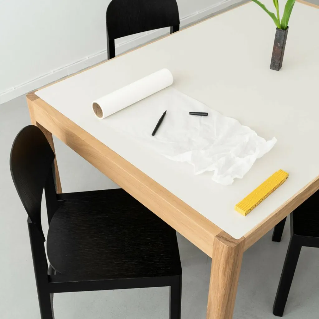 Die erfolgreiche Jungdesignerin Cecilie Manz kombiniert für den Workshop Tisch L 140cm das traditionelle Handwerk mit subtilen Details, die eine einfache und gleichzeitig expressive Optik kreieren. In dem 140cm langen Möbelstück wird die Essenz der Idee eines Tisches klar ersichtlich. Zurückhaltend in dem Gesamteindruck, dafür aber umso lauter in den Details und Verbindungen, ist dieser Esszimmertisch das perfekte Objekt für echte Kenner der skandinavischen Lebensart. Der aus massiver Eiche und Eichenfurnier gefertigte Workshop Tisch L 140cmist 92cm breit und 73cm hoch. Die Tischfläche ist mit einem hellen Linoleum überzogen, das sich im täglichen Einsatz als besonders pflegeleicht erweist. Elegante Details wie die gekonnt ineinandergreifenden Beinverbindungen machen aus dem Tisch den Mittelpunkt des Raumes. Mit klassischen Stühlen bleibt der Tisch im Fokus, während extravagante Sitzmöbel ihn als klare Bühne nutzen können.