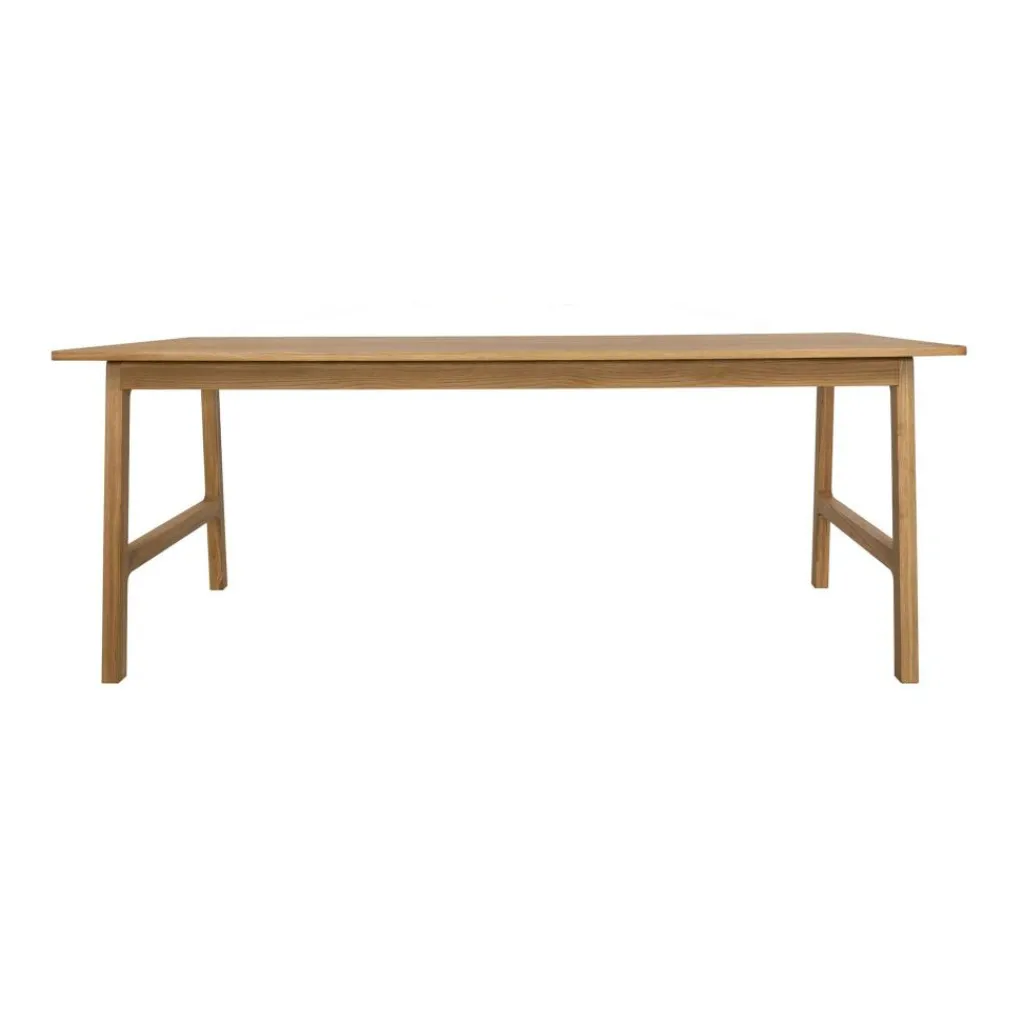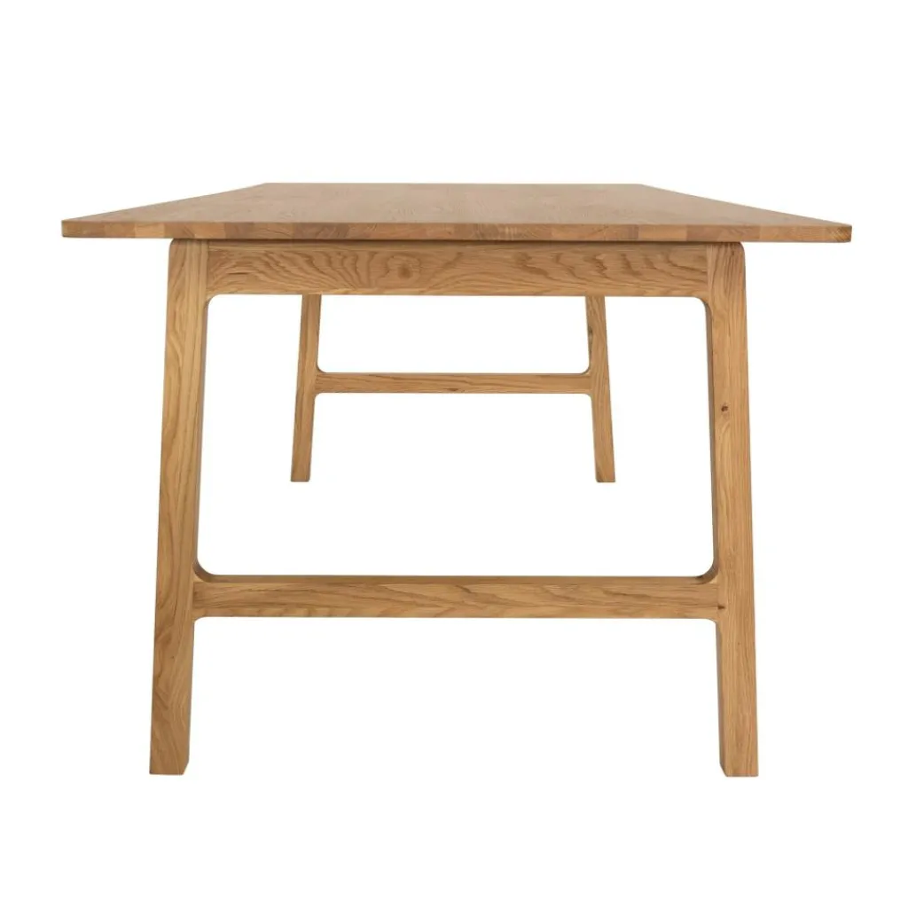 Hergestellt aus hochwertigem Eichenholz ist der Leef Esstisch 200x95cm nicht nur ein langlebiges und robustes Möbelstück. Er bringt mit seiner zartgemaserten Struktur auch ein natürliches Flair ins Interieur. Seine geölte Oberfläche bietet zudem eine angenehm weiche Haptik. Die großzügige, schlanke Eichenholzplatte hat ein kantiges Profil. Darunter fällt ein harmonisch ausgearbeitetes Gestell auf, das ebenfalls aus massivem Eichenholz besteht. Die leicht ausgestellten Beine sind mit Verstrebungen zu Rahmen verbunden, sodass der Leef Esstisch 200x95cm maximale Stabilität bei größtmöglicher Beinfreiheit garantiert. Dabei weisen die kantigen Elemente zierlich abgerundete Anschlussstellen auf. Dies macht den Leef Esstisch 200x95cm zu einem dekorativen Möbelstück, das ebenso als Treffpunkt für die Familie wie als Versammlungsort bei der Arbeit dienen kann. So passt er in eine Kantine, ins Büro oder das Wohnzimmer.