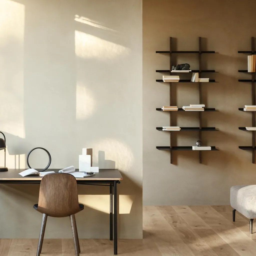 Das Smile Set Regalsystem S zeigt, wie stilvoll minimalistische Einrichtung sein kann. Einmal mehr wird das Designerduo, das hinter Tools Design steckt, seinem Anspruch gerecht, Möbel zu erschaffen, wo die Form der Funktion folgt. Gekonnt setzt das Smile Set Regalsystem S Dekorationsartikel, Bücher und viele weitere Gegenstände in Szene. Es kann im Wohn- oder Schlafzimmer, im Büro oder sogar in der Küche verwendet werden. Als Basis dienen zwei Eichenholzwangen, die senkrecht montiert werden. Darin sind Schlitze eingearbeitet. Sie tragen die beiden Einlagebretter. Sie werden einfach eingesteckt und müssen nicht zusätzlich mit Halterungen oder Stifte arretiert werden. Die Einlageböden sind hinten nach oben gebogen, sodass Bücher und andere Utensilien nicht herunterfallen können. Die Böden werden aus robustem, pulverbeschichtetem Stahl hergestellt.