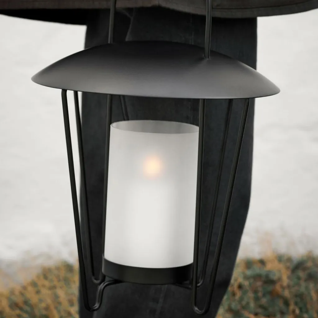 Ein formschöner Zylinder aus Glas bildet den Kolben, der für eine Kerze konzipiert ist und in einem Gestell aus beschichtetem Edelstahl steht. Seine milchige Oberfläche erzeugt einen angenehm sanften Lichtschein, während die hohe Wand verhindert, dass die Flamme aufgrund von eindringendem Seitenwind flackert. Darüber spannt sich eine Schale, die den Laternenkolben wie ein Schirm überragt. Zu einem Gestell gebogener Rundstahl verbindet die Elemente zu einer harmonischen Einheit und bildet gleichzeitig einen Griff und vier kufenartige Standbeine. So lässt sich die Abri Laterne in der Hand tragen, auf einen Haken hängen oder auf einen ebenen Untergrund stellen. Dabei eignet sie sich für den Einsatz unter freiem Himmel, die Terrasse, den Wintergarten oder die Fensterbank im Wohnzimmer. Die Reinigung erfolgt einfach mit einem feuchten Tuch.