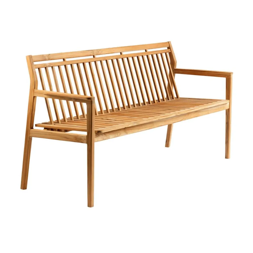 Die M11 Sammen Gartenbank mit Rückenlehne 3-Sitzer ist wie eine klassische Parkbank konzipiert: Die Sitzfläche ist aus Lamellen geformt, die sich nicht ganz berühren. In den Spalt ist jeweils eine Strebe eingearbeitet, die Teil der Rückenlehne ist. Die Rückenlehne ist leicht nach hinten geneigt, was für einen ausgezeichneten Sitzkomfort sorgt. Die Sitzfläche ragt vorne eine wenig über den Rahmen hinaus. Gefertigt wird die M11 Sammen Gartenbank mit Rückenlehne 3-Sitzer aus Teakholz. Das Naturmaterial trägt das FSC®-Siegel: Das attestiert die Herkunft aus verantwortungsbewusster Forstwirtschaft. Damit das Material seine charakteristische Farbe behält, muss es zweimal pro Jahr geölt werden.
