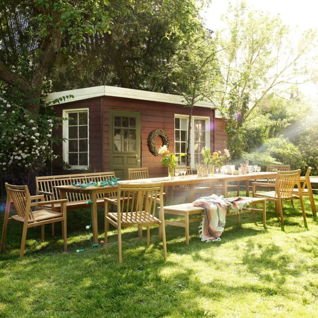 Der M2 Sammen Teakholz Gartentisch hat eine Länge von 220 cm und eine Breite von 90 cm. Er ist 75,5 cm hoch und wiegt 31,5 kg. Passend zum großzügigen Gartentisch sind Armlehnstühle und Bänke erhältlich. Der M2 Sammen Teakholz Gartentisch lässt sich mithilfe verschiedener Erweiterungsplatten vergrößern. Alternativ steht ein kleinerer, quadratischer Tisch zur Auswahl.