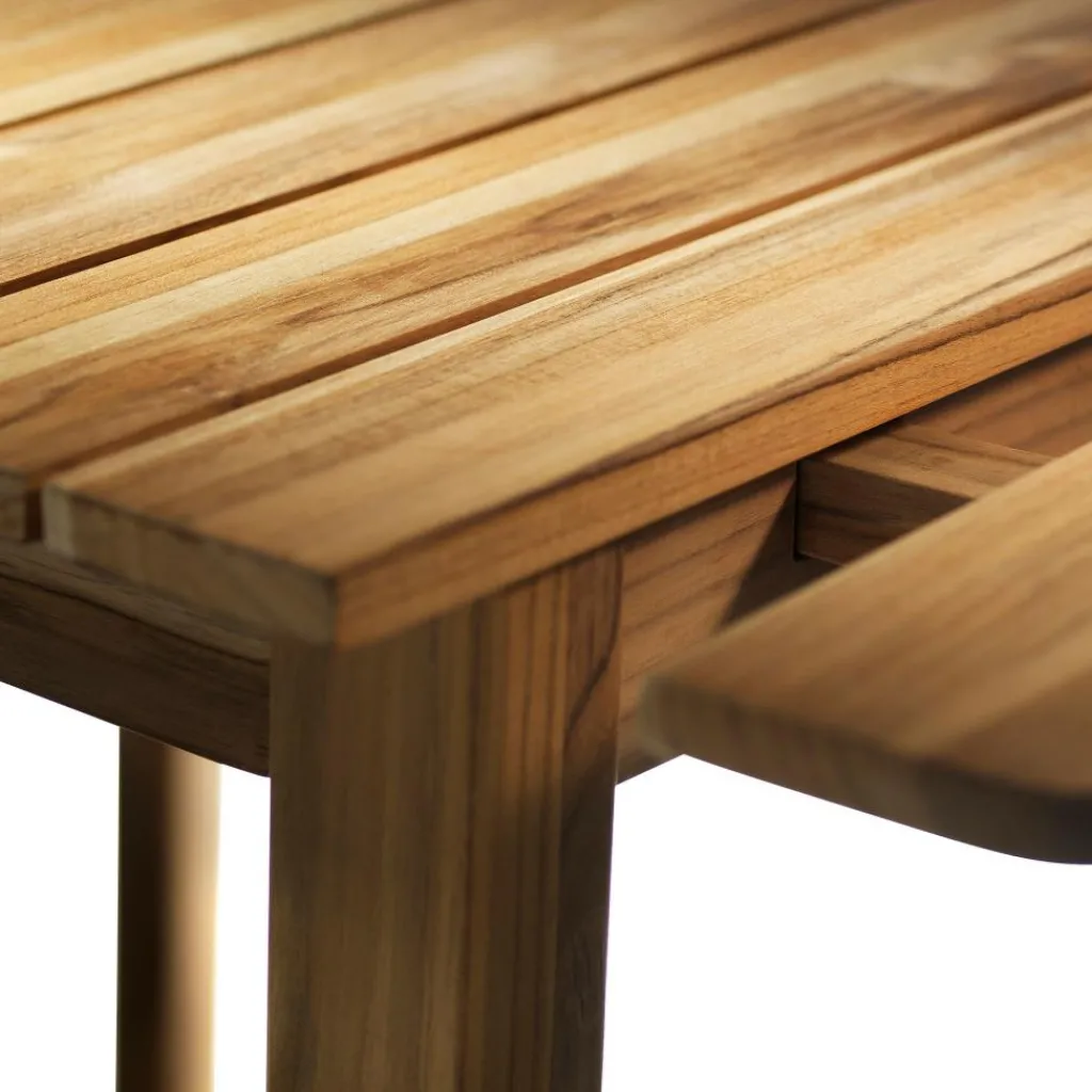 Mit seinen kantigen Beinen und dem einfachen Rahmen zeichnet sich der M2 Sammen Teakholz Gartentisch durch ein glattes Design aus. Nur die Tischplatte, die sich aus gleichförmig aneinandergereihten Latten zusammensetzt, zeigt eine rhythmische Struktur. Für reizvolle Kontraste sorgt die zarte Maserung des Teakholzes aus FSC®-zertifizierter Herstellung. Die geölten Oberflächen verschaffen dem Gartentisch darüber hinaus eine angenehme Haptik. Wird er regelmäßig nachgeölt, so behält er seine natürliche Farbe. Der M2 Sammen Teakholz Gartentisch ist ein einladender Treffpunkt im Garten, wo sich die ganze Familie versammelt. Für Feste mit Freunden lässt sich seine Tischplatte ganz einfach erweitern. Weiters passt das Designmöbel auch in die Freiräume von Hotels oder auf Terrassen naturnah gestalteter Restaurants.