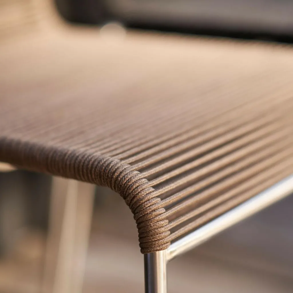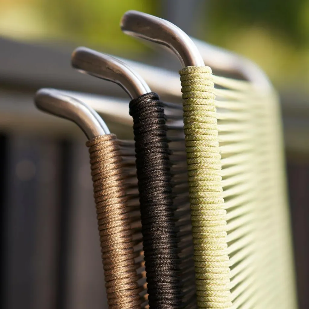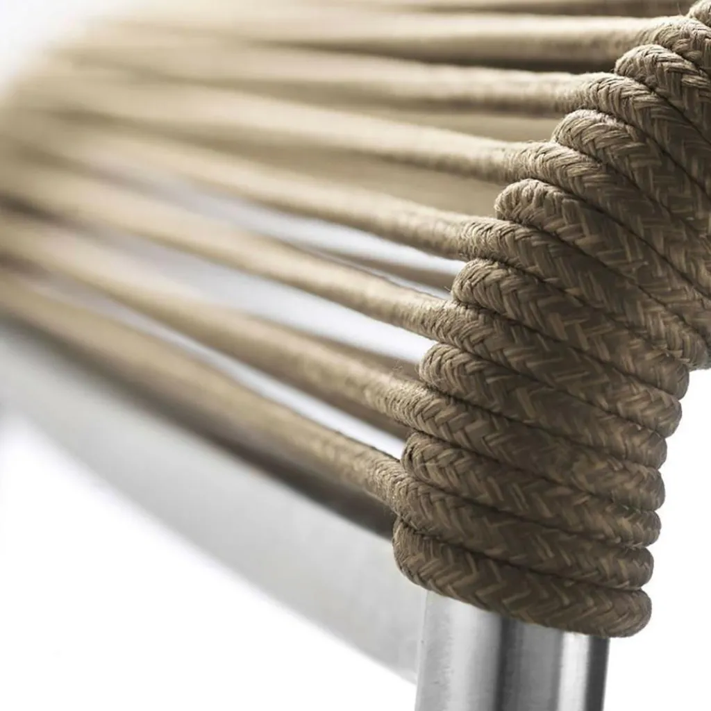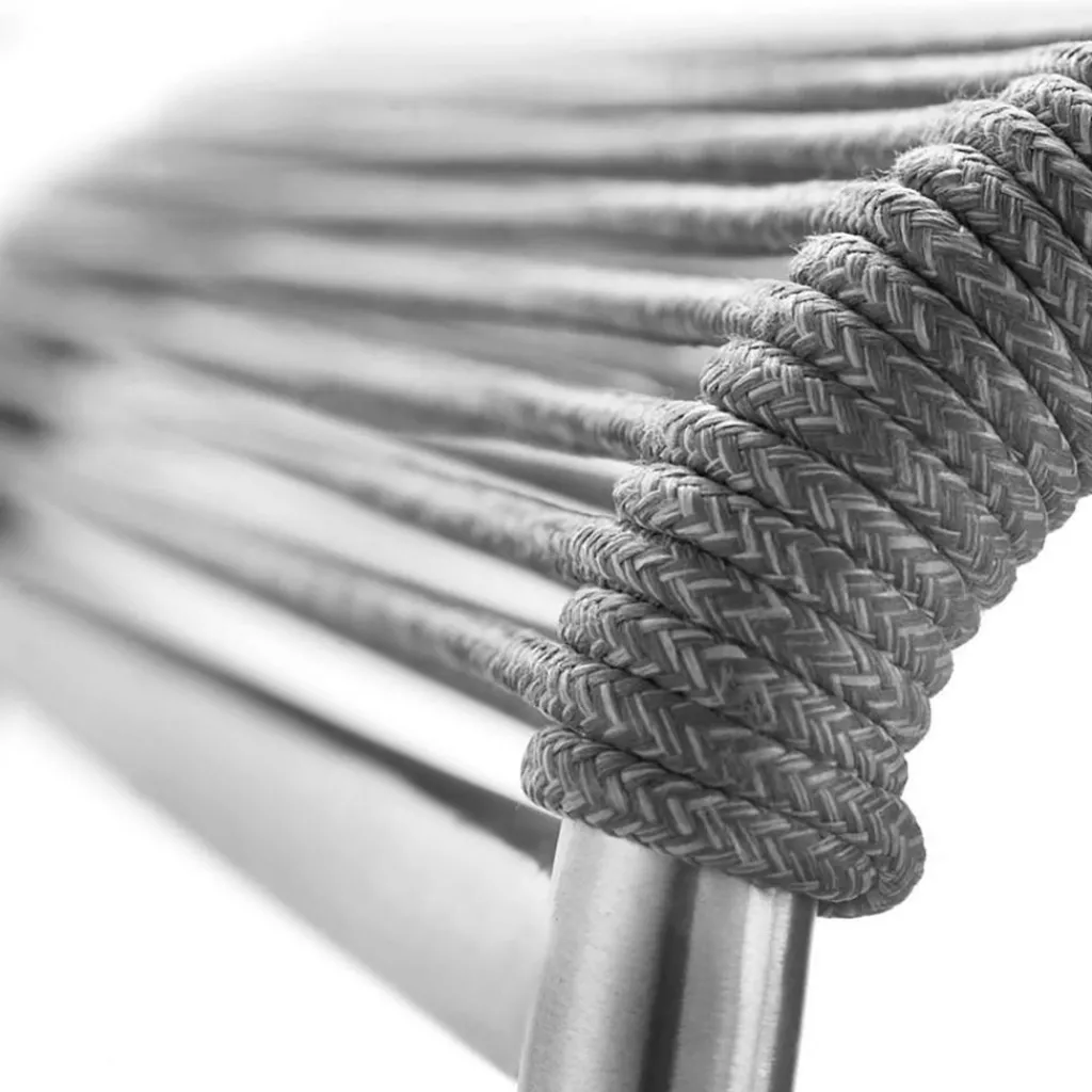 Als Basis verwenden die Designer für den M20 Teglgård Gartenstuhl rostfreien Stahl. Somit kann das Modell auch bei schlechtem Wetter im Freien bleiben. Sollte sich einmal eine längere Regenperiode ankündigen, kann der Stuhl gestapelt und platzsparend in einer Gartenhütte oder im Keller verstaut werden. Der elegante Stahlrohrrahmen weist an den Seiten abgerundete Kanten auf. Die Sitzfläche und die Rückenlehne sind aus Kordel hergestellt. Ein großer Vorteil ist, dass Nässe rasch zwischen den Kordeln abfließen kann. Somit ist der M20 Teglgård Gartenstuhl rasch wieder einsetzbar. Das textile Material wird in den Rahmen gespannt. Es gibt den M20 Teglgård Gartenstuhl in verschiedenen Farben. Die Sitzfläche ist an der Vorderseite ein wenig nach unten gezogen. An der Rückseite beschreibt der Rahmen einen leichten Knick nach hinten.