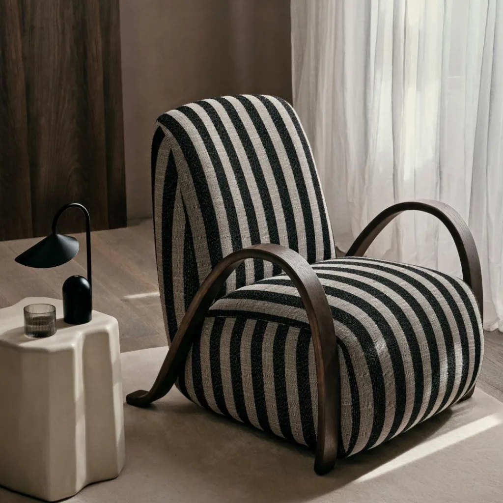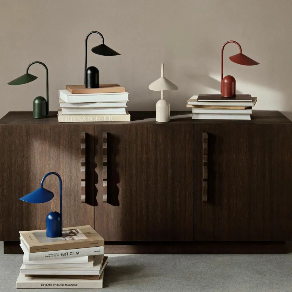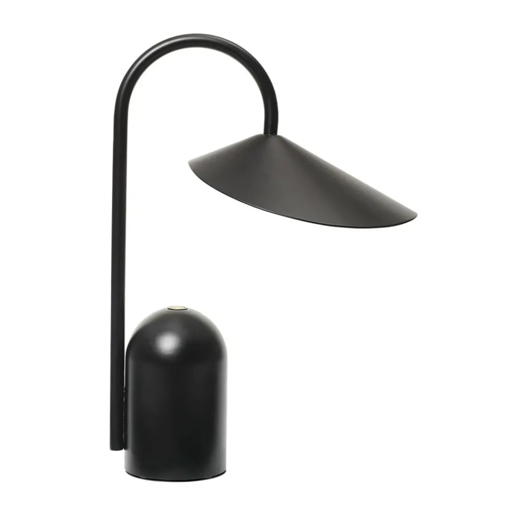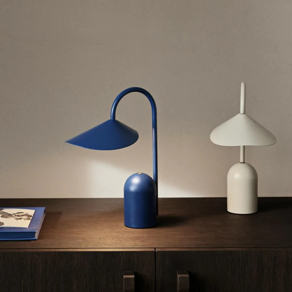 Die Arum Portable Tischleuchte mit Akku wurde für die Marke Ferm Living entworfen. Arum ist der Name einer tropischen Pflanze, die mit ihrem hohen schlanken Stil und ihren eindrücklich geformten Blütenblättern als Inspiration für die tragbare Leuchte diente.