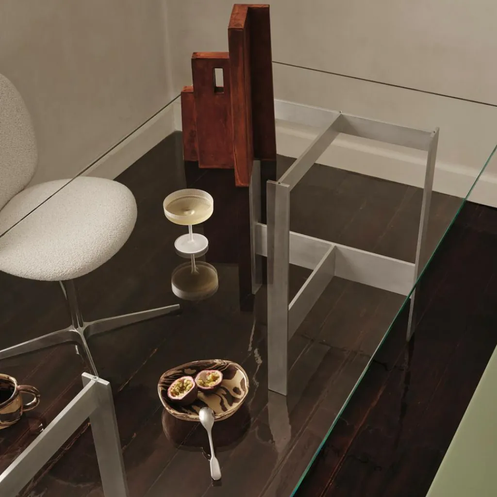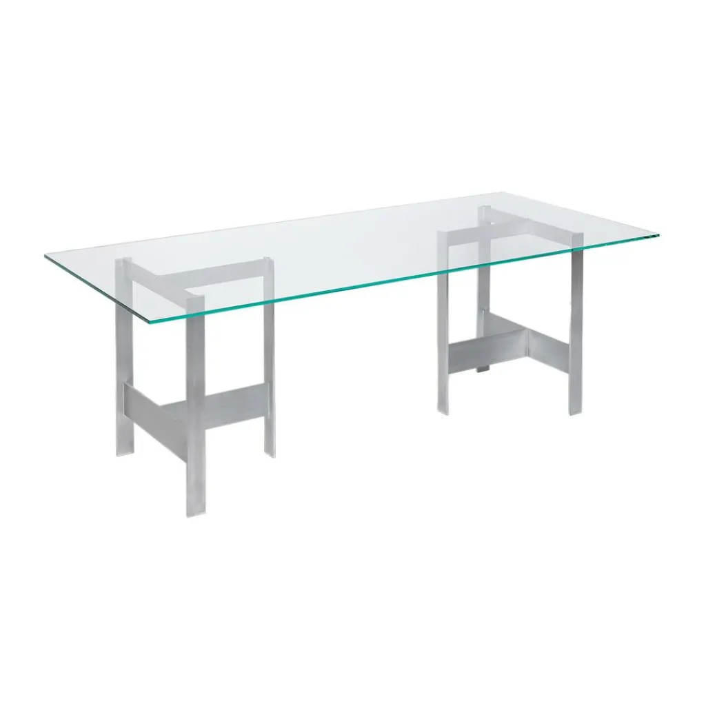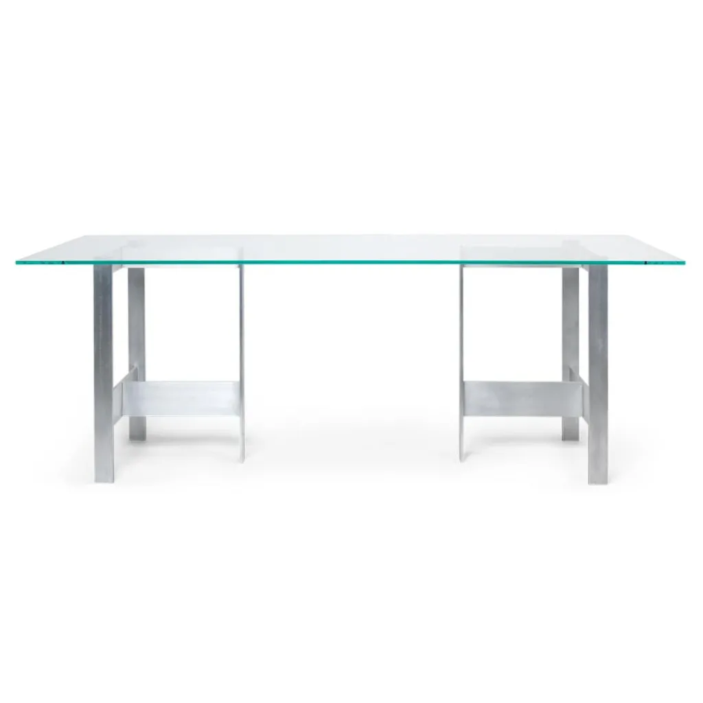 In seiner schlichten Ästhetik und der Sichtbarmachung seiner Konstruktionsweise erinnert der moderne Lager Esstisch 200x90cm an brutalistische Designprinzipien. Auffallend sind seine groben satinierten Aluminiumbeine. Sie sorgen nicht nur für Stabilität. Sie betonen auch die simple rechteckige Form des Möbelstücks. Die Tischplatte aus Glas bildet einen faszinierenden Kontrast zu den zwei kantigen, aus längs- und Querstreben bestehenden Metallböcken und verleiht diesen eine zusätzliche Präsenz. Um ein Verrutschen zu verhindern, werden vor dem Auflegen der eleganten Platte transparente Gummistopper montiert, die im Lieferumfang enthalten sind. Der Tisch ist vielseitig einsetzbar und bildet sowohl im Esszimmer als auch in der Küche und im Büro einen unverwechselbaren Blickfang. Er verfügt über eine Gewichtskapazität von maximal 100kg. Zur Reinigung empfiehlt sich ein weiches, feuchtes Tuch und mildes Reinigungsmittel.