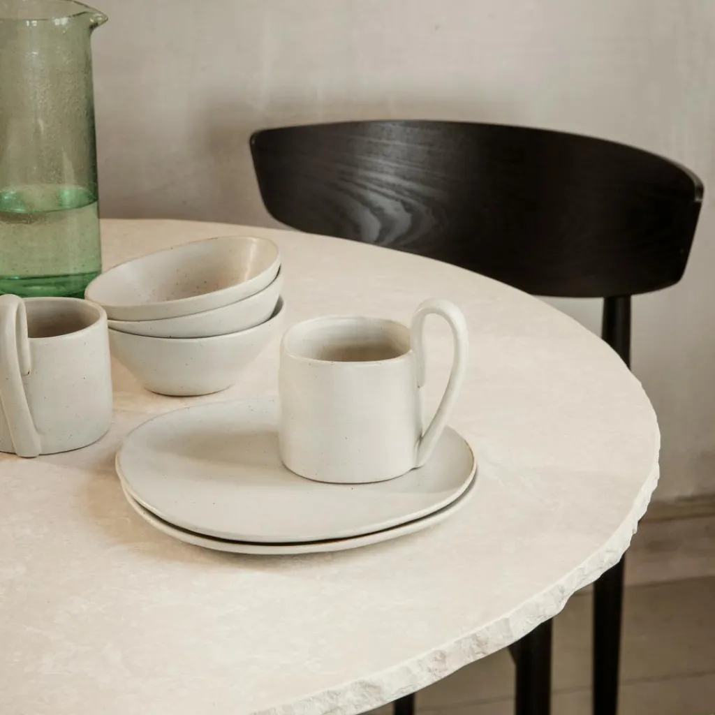 Der Mineral Esstisch ist rund mit einem Durchmesser von 90 cm. Die Tischhöhe beträgt 72 cm. Er ist 54 kg schwer. Passend dazu gibt es aus der Mineral-Serie einen kleineren Kaffeetisch und einen Couchtisch.
