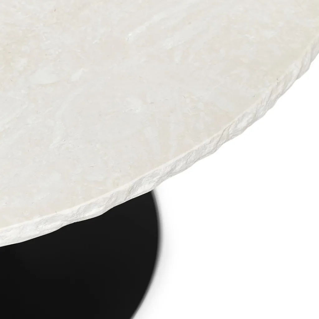 Beim Mineral Esstisch ist es die weiße Steinplatte, die für einen edlen Hingucker sorgt. Sie besteht aus Bianco-Curia-Marmor und macht dank dessen natürlicher Beschaffenheit und der gebrochenen, von Hand gemeißelten Kante jeden Mineral Esstisch zum Unikat. Die mit einer diamantbestückten Bürste behandelten und belederte Oberfläche ist beständig gegen Wasserflecke. Einen deutlichen Kontrast zur hellen Tischplatte bildet der schwarze Unterbau des Mineral Esstisches. Dieser setzt sich aus einem einzelnen runden Bein und einer kreisrunden Fußscheibe zusammen. Sie bestehen aus pulverbeschichtetem und verzinktem Stahl, was den Esstisch nicht nur stabil und robust macht, sondern auch widerstandsfähig gegen Rost. Der Mineral Esstisch lässt sich einfach mit einem feuchten Tuch reinigen. Er macht sich gut in einem Ensemble mit schwarzen Stühlen und passt ins private Esszimmer ebenso wie in ein schickes Hotel.