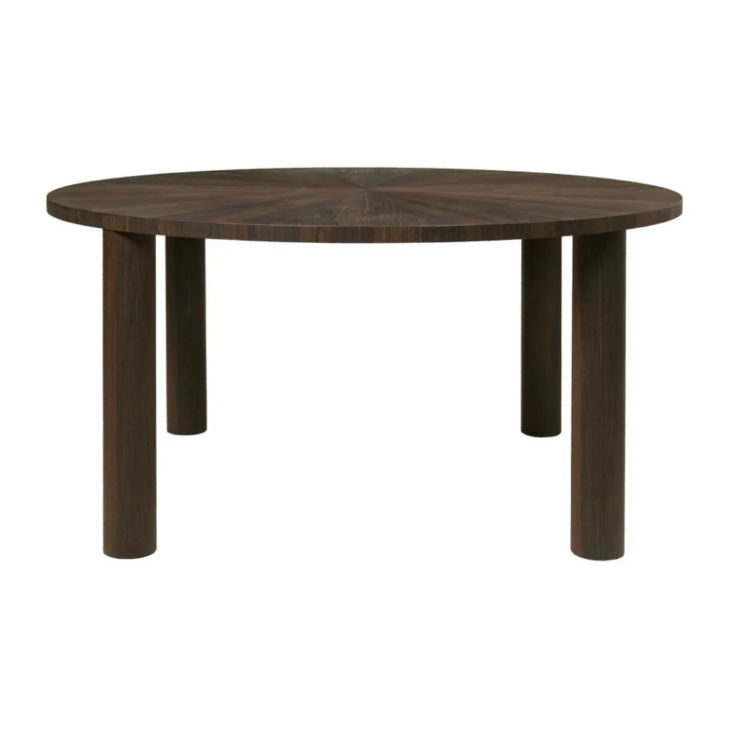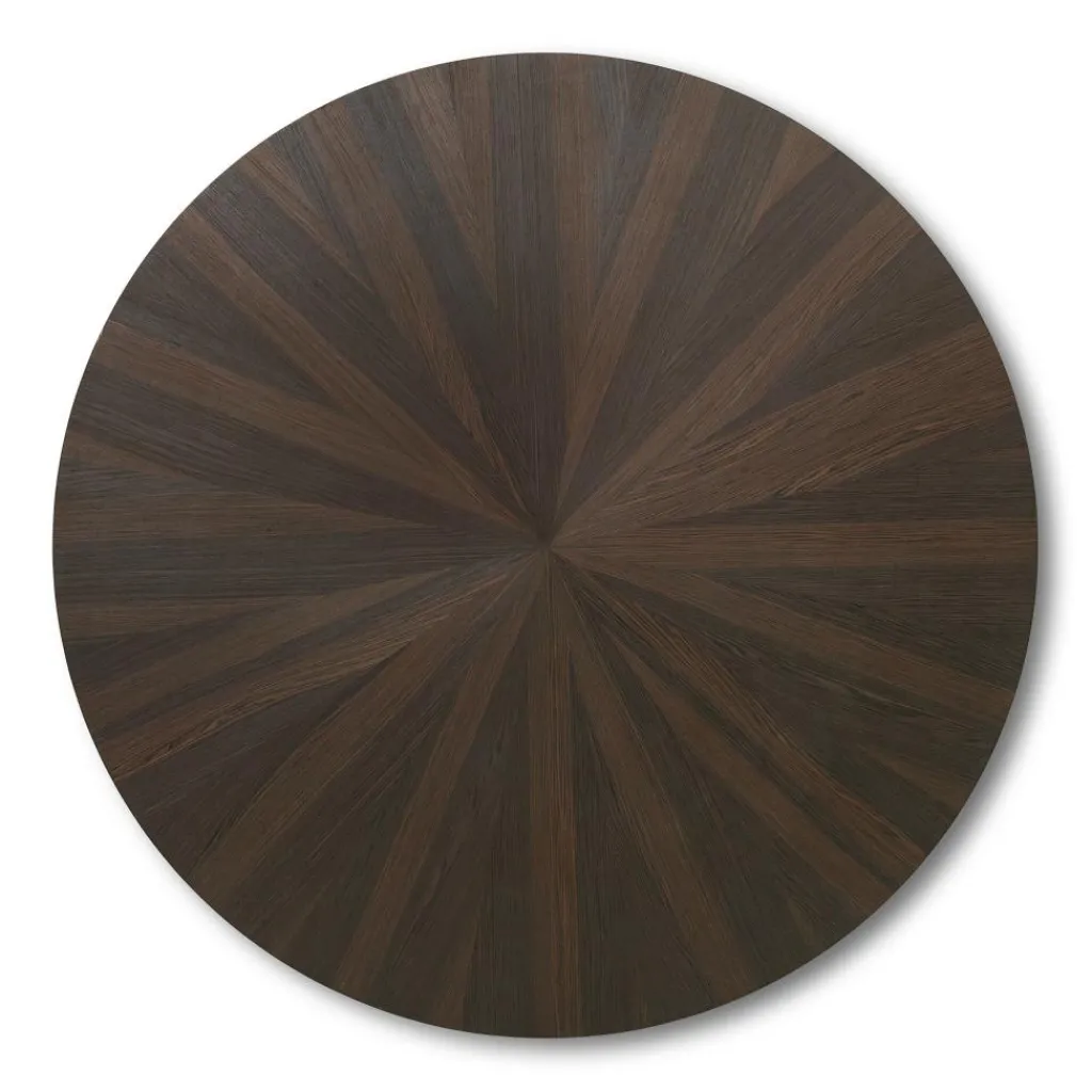 Seine großzügige, kreisrunde Tischplatte mit einer detaillierten, sternförmig angelegten Holzmaserung macht den Post Stern Esstisch zum attraktiven Hingucker. Sie ist mit einem edlen Furnier aus geräuchertem Eichenholz beschichtet und von Hand in Marketerietechnik hergestellt. Seine vier geraden, zylindrischen Beine lassen den Designtisch nicht nur stabil und robust erscheinen. Sie irritieren zudem unter der verhältnismäßig schlanken Tischlatte mit ihrer überproportionalen Breite. Doch wirken auch sie sehr detailliert dank ihrer fein gemaserten Oberfläche. Der Kern der Tischkonstruktion besteht aus massivem Schichtholz, das ebenso wie das Holz für das Furnier aus FSC®-zertifizierter Herstellung kommt. Damit punktet der Post Stern Esstisch auch durch seine nachhaltige Herstellung. Er ist einfach mit einem feuchten Tuch zu reinigen. Der Post Stern Esstisch bietet im Wohnzimmer Platz für Familie und Freunde und eignet sich auch für Konferenzen im Büro.