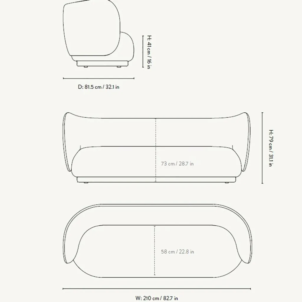 Das Rico 3-Sitzer Sofa hat eine Sitzhöhe von 41 cm und kann mit beliebigen Couchtischen kombiniert werden. Die 65 kg schwere Sitzgelegenheit, die sich mit sanft gerundeten Ecken auszeichnet, ist 210 cm breit. Die Höhe beträgt 79 cm und die Tiefe 81,5 cm.