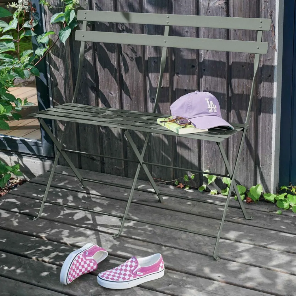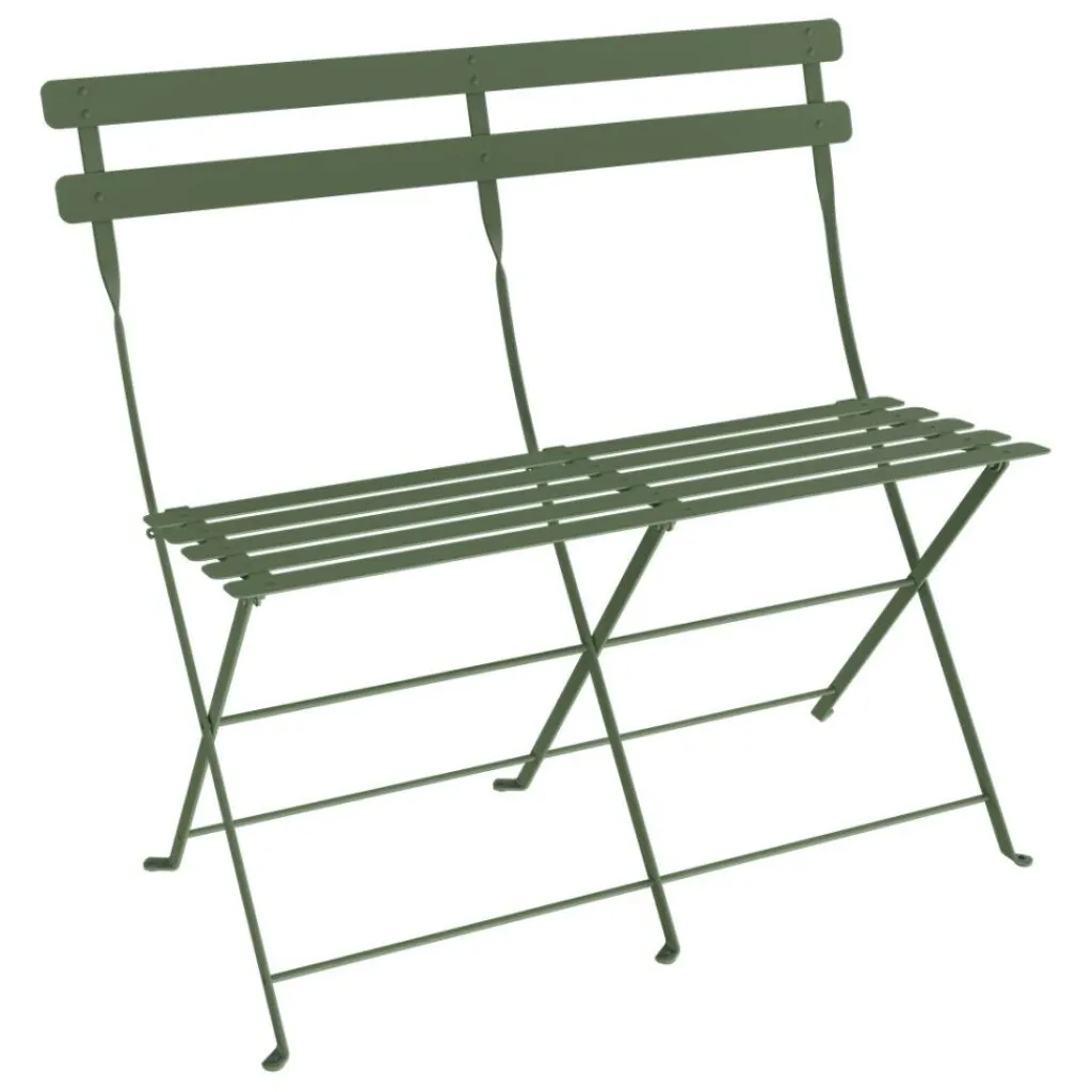 Die Bistro 2-Sitzer Klappbank wurde für die Marke Fermob entworfen. Sie ist Teil der Bistro-Kollektion mit vielen farbenfrohen Stühlen, Bänken und Tischen für den Außenbereich.