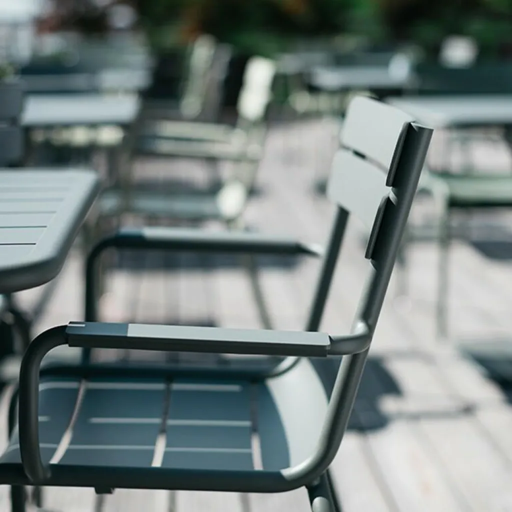 Eine nach hinten geneigte, leicht eingebuchtete Rückenlehne, eine ergonomisch geformte und über die Kanten gewölbte Sitzfläche und nach außen gebogene Armstützen sind die Elemente, die den Luxembourg Gartenarmlehnstuhl zu einem gemütlichen Sitzmöbel machen. Seinen breiten, dicht aneinandergereihten Aluminiumlatten verdankt er zudem seine attraktive Optik. Hergestellt aus hochwertigem Aluminiumrohr verspricht der Stuhlrahmen eine hohe Stabilität und Robustheit. Die Pulverlackierung macht ihn darüber hinaus langlebig und UV-beständig. Der Luxembourg Gartenarmlehnstuhl passt in ein Atrium, auf eine Terrasse, in einen Park oder Garten eines Retro-Cafés und Designhotels oder vor das private Gartenhaus.