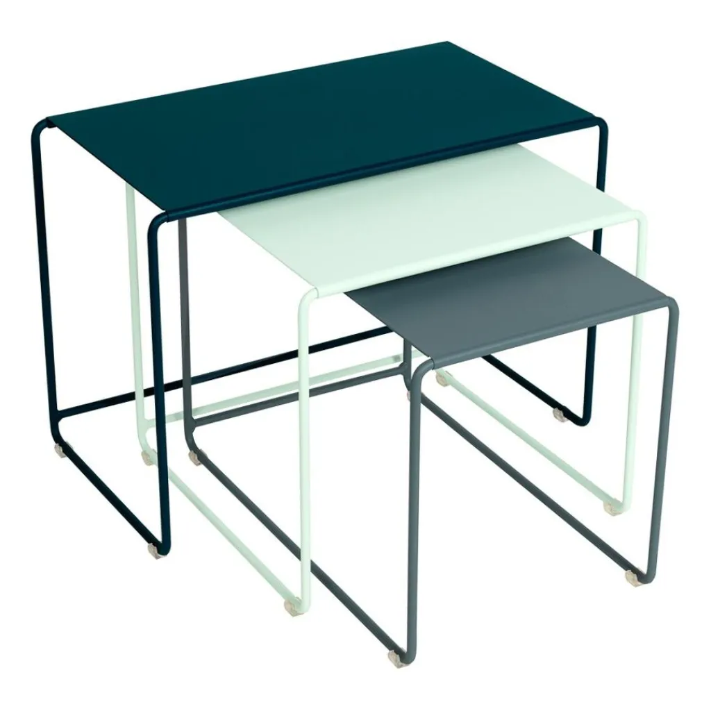 Das Oulala Gartenbeistelltisch 3er Set wurde für die Marke Fermob entworfen. Das Trio ist ein verspieltes Ensemble von Couchtischen, deren Bezeichnung auf den bewundernden Ausruf Oulala anspielt. Es besteht aus drei verschiedenen Tischchen, die sich ineinanderschieben lassen.
