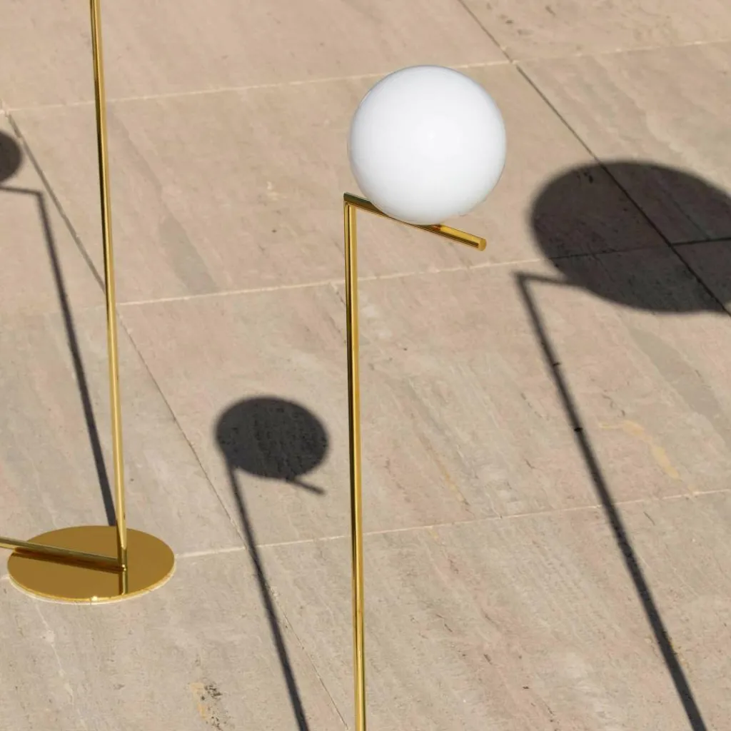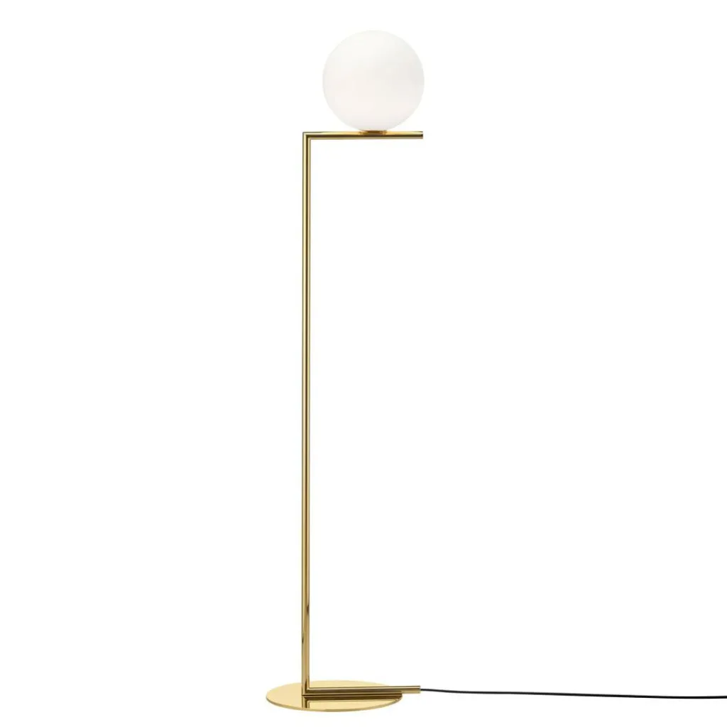 Ein Diffusor aus kugelrund geblasenem Opalglas balanciert bei der Stehleuchte auf einem filigranen Stabgestell. Eine runde, flache Sockelplatte dient der 10th Anniversary Edition IC F1 Stehleuchte als Fuß. Darauf ist ein Stab befestigt, der oben und unten im rechten Winkel geknickt ist. Dieses Gestell ist in der Sonderedition aus Messing mit einer 24-Karat-Vergoldung gearbeitet. Der Diffusor balanciert auf dem Stab oben und strahlt sein blendfreies Streulicht in alle Richtungen aus. Es wird ein Leuchtmittel mit E14-Fassung benötigt, das sich über den Schalter im Kabel dimmen lässt.