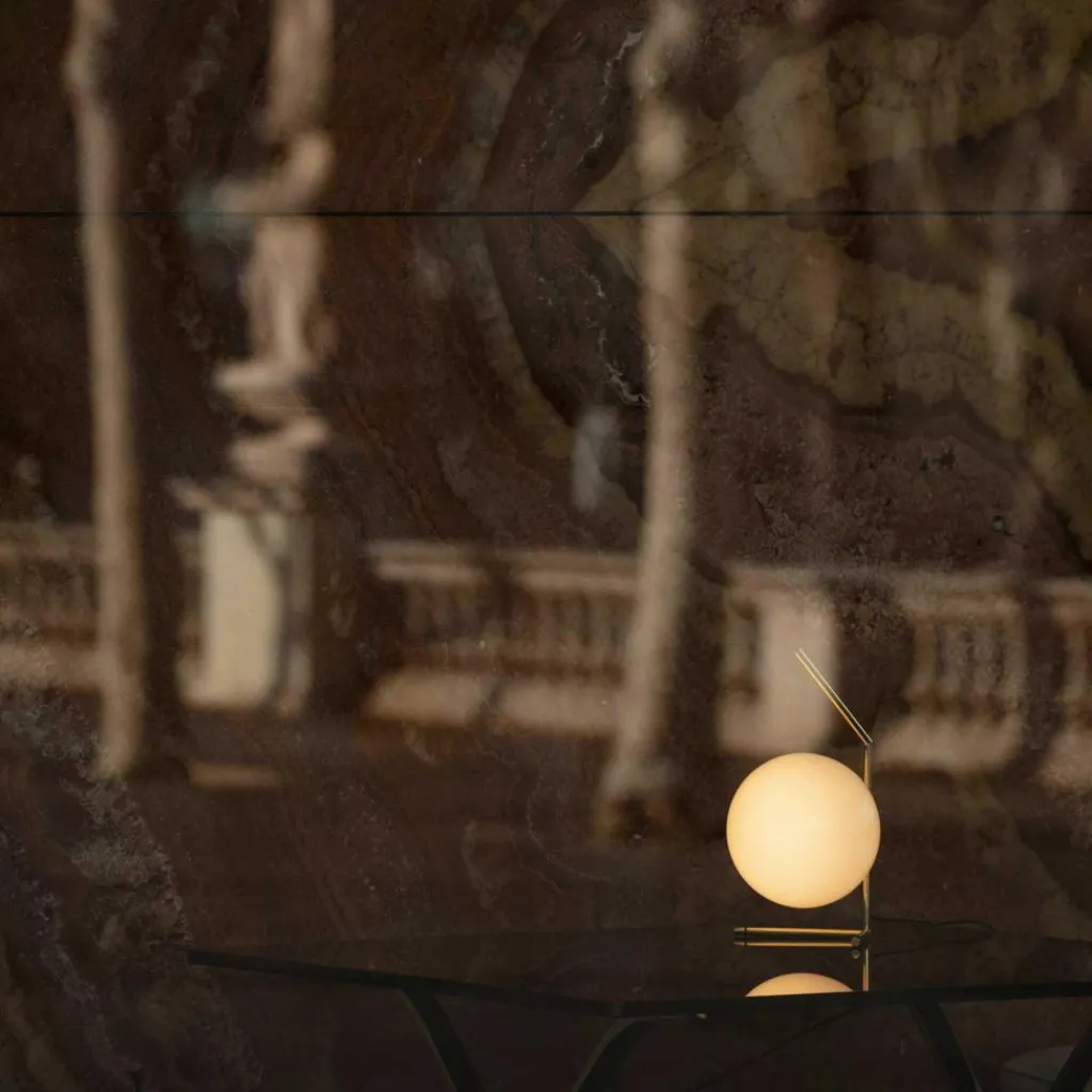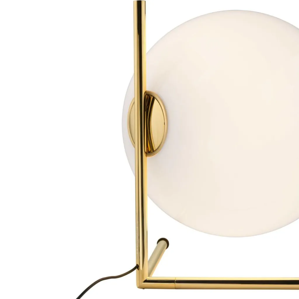 Das Spiel der Balance zeichnet das Design der 10th Anniversary Edition IC T1 Low Tischleuchte aus. Eine Kugel als Diffusor bildet das Grundelement, das an einem Stahlstab hängt. In der Sonderedition ist dieser Stab mit 24 Karat Vergoldung gearbeitet. Er dient mit einem Knick im stumpfen Winkel als Halterung des Diffusors sowie als Standfuß. Dabei verlaufen im 90-Grad-Winkel waagerecht zwei Stäbe mit kleinen Fußringen. Der opale Diffusor aus geblasenem Glas ist an einer runden Scheibe befestigt. Aus ihm strahlt blendfreies Streulicht in alle Richtungen aus.
