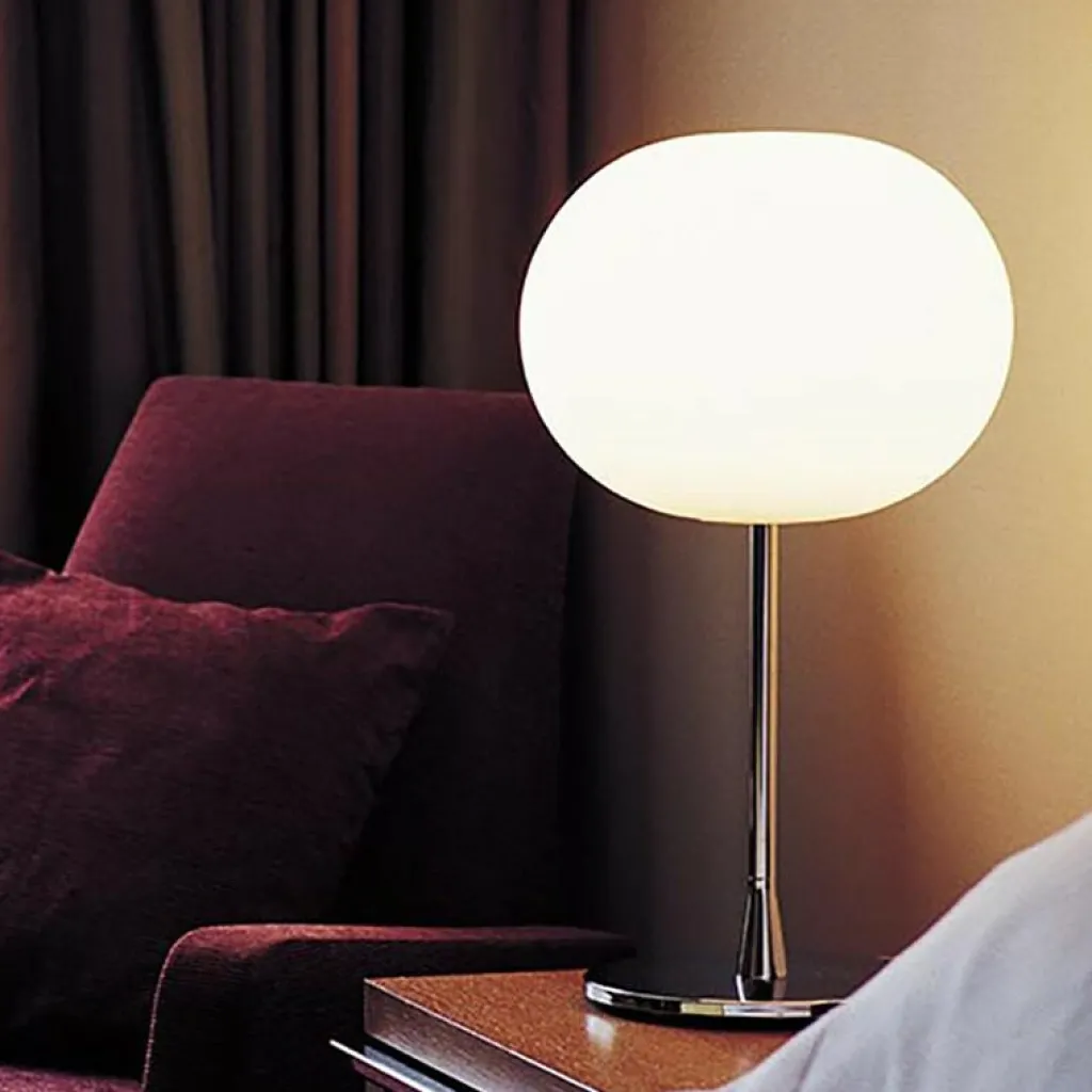 Mit ihrer schlanken Form macht die Glo-Ball T1 Tischleuchte auf dem Schreibtisch im Büro oder im Homeoffice, auf dem Nachttisch oder einer Kommode eine gute Figur. Ein Sockel aus massivem Stahl bildet die Basis, aus der ein Stahlrohr entspringt. Es ist mit einer Halterung aus Aluminiumlegierung mit dem Diffusor verbunden. Das Gestell ist in verschiedenen Farben erhältlich. Markant ist der Leuchtenschirm, der aus mundgeblasenem Opalglas besteht. Wenn man den Schalter betätigt, der im 190 cm langen Kabel integriert ist, sieht die Glo-Ball T1 Tischleuchte wie ein glühender Ball aus. Darauf bezieht sich auch der Name. Stimmungsvolles Ambiente verbreitet die Leuchte, wenn man den Dimmer betätigt, der im Schalter integriert ist.