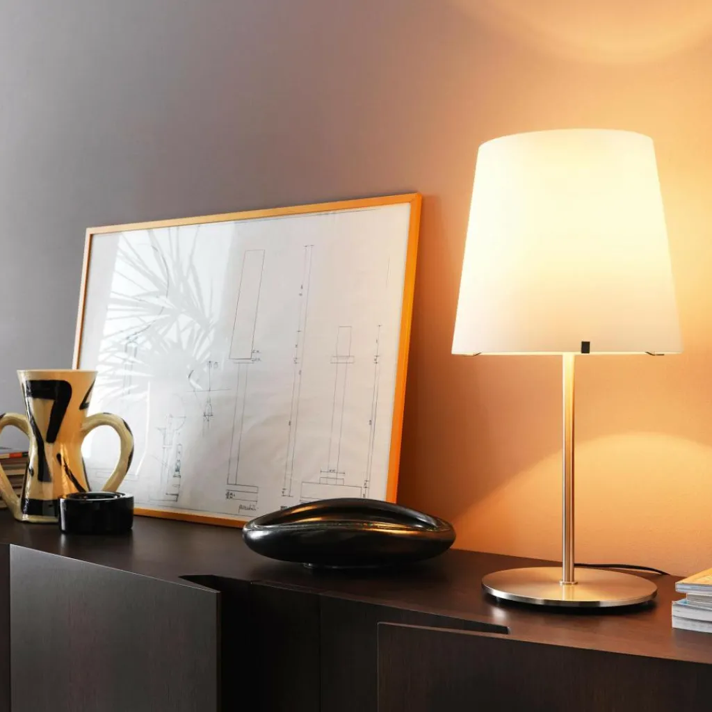Die 3247TA Tischleuchte H60cm braucht ein Leuchtmittel mit einer E27-Fassung. Das Licht wird nach unten weitergeleitet und dringt durch den opalen Leuchtenschirm. Das Modell hat ein Gewicht von 4,7 kg. Der Leuchtenschirm hat einen Durchmesser von 32 cm. Das Modell ist 60 cm hoch. Aus derselben Kollektion gibt es auch Stehleuchten und Tischleuchten in anderen Größen.