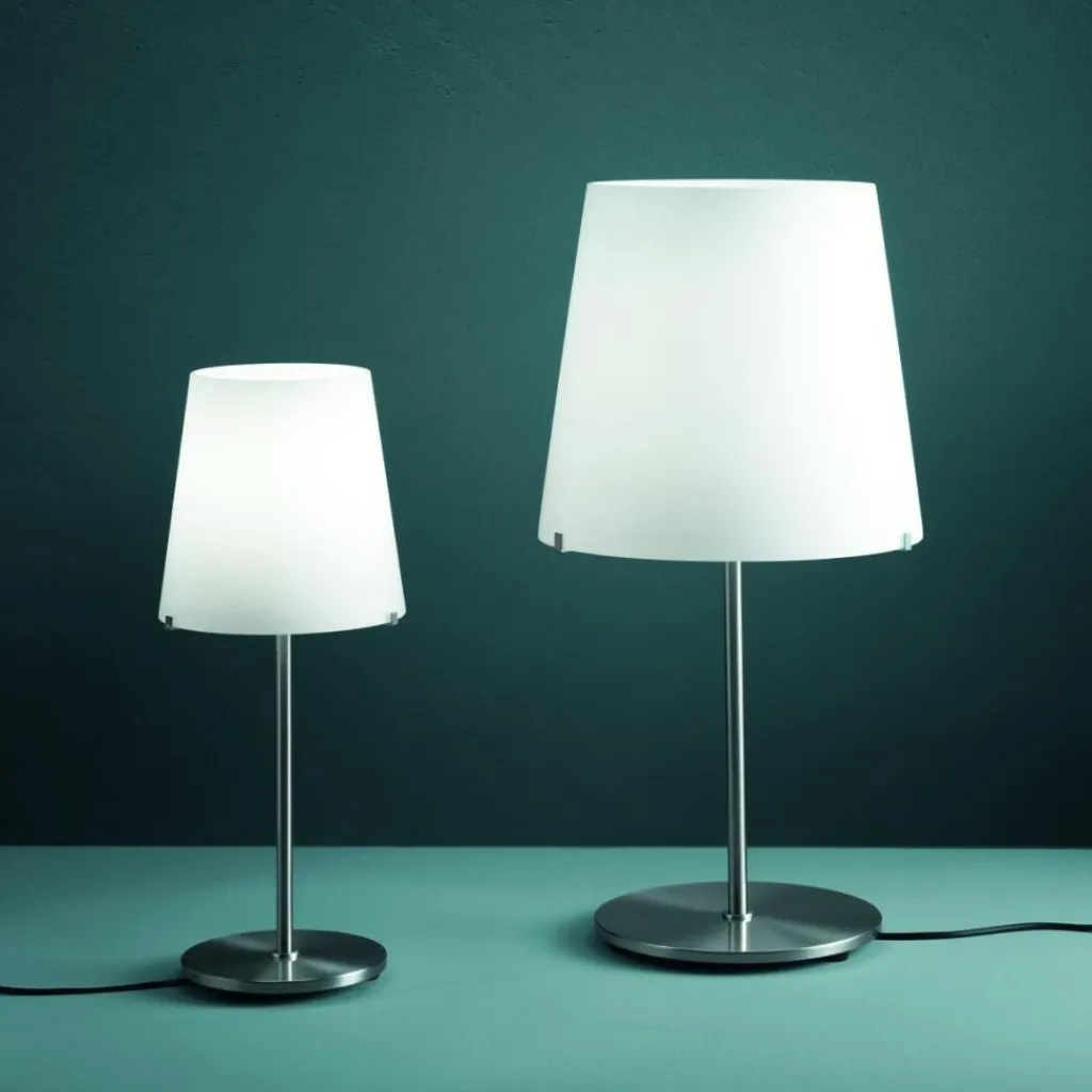 Die 3247TA Tischleuchte H60cm beschränkt sich auf die wesentlichen Elemente einer Tischleuchte: Ein Gestell aus gebürstetem vernickelten Metall sorgt für sicheren Stand. Die Basis ist eine Scheibe, aus der sich ein Stab erhebt. Er trägt den imposanten Leuchtenschirm, der eine konische Form hat. Der Diffusor besteht aus opalem Glas. Es wird mundgeblasen. Ein schwarzes Kabel verbindet die elegante 3247TA Tischleuchte H60cm mit dem Stromkreis. Es enthält den Schalter mit Dimmer. Man kann die Helligkeit nach Belieben einstellen. So herrschen am Arbeitsplatz im Büro oder Homeoffice, am Nachttisch oder an jedem anderen Einsatzort stets beste Lichtverhältnisse.