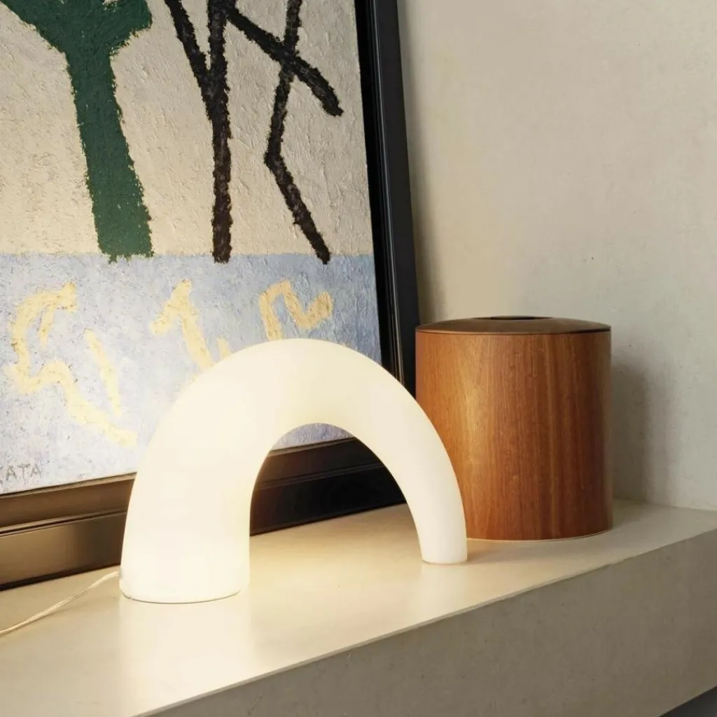 Die Designleuchte besteht aus einem Diffusor aus weißem, geblasenem Mattglas und erinnert in ihrer Form an ein rundgeschwungenes Tor. In ihrer Extravaganz bietet es sich an, die Tischleuchte auf einem Beistelltisch in Szene zu setzen. Sie kann aber auch als Bodenleuchte oder Regalleuchte wunderbar zur Geltung kommen. In jedem Fall fungiert Thor als Highlight in jedem Raum.