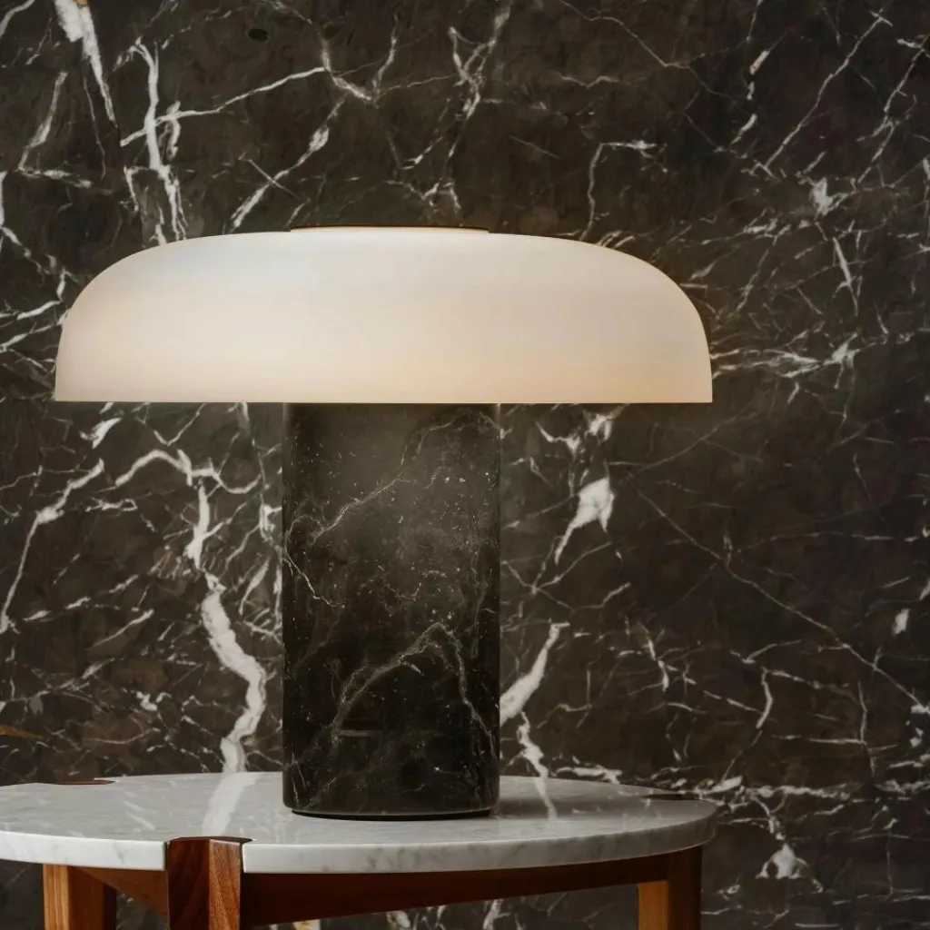 Für die Tropico Media LED Tischleuchte verwenden die beiden Designer einen Materialmix: Der zylinderförmige Fuß besteht aus edlem Marmor. Das Material hat sich seit Jahrtausenden als Baustoff bewährt und verbreitet edles Flair. Darauf sitzt ein halbrunder, abgeflachter Diffusor aus mundgeblasenem Opalglas. In der Mitte des Diffusors ist oben ein verspiegelter Metallknopf angebracht Die Tropico Media LED Tischleuchte spendet blendfreies und diffuses Licht. Sie eignet sich für jeden Schreibtisch – egal ob im Büro oder im Homeoffice. Doch auch auf einem Couchtisch oder im Schlafzimmer macht sie eine gute Figur.