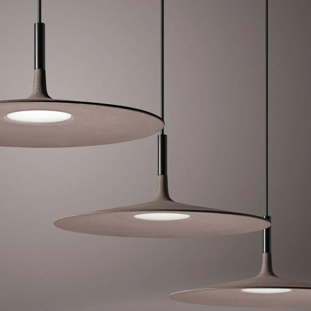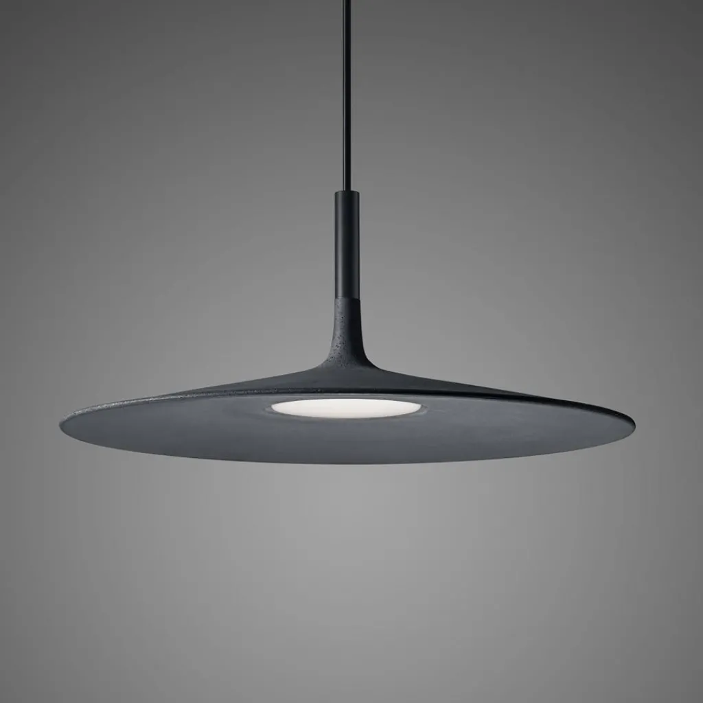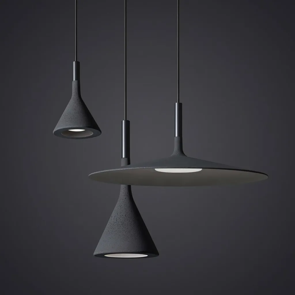 Die Aplomb Large LED Pendelleuchte wurde von den Designern Paolo Lucidi und Luca Pevere für den Hersteller Foscarini entworfen. Es mag im ersten Moment erstaunlich klingen, aber die Aplomb Large LED Pendelleuchte besteht tatsächlich aus Beton. Und sie ist groß, mit einem stattlichen Durchmesser von 45 cm sogar ziemlich groß für eine Pendelleuchte. Neben dem Schirm aus Beton kommen Materialien wie Aluminium und Polycarbonat zum Einsatz, was das Gesamtkunstwerk, als das man diese Leuchte bezeichnen muss, zu einem rundum stimmigen Wohnaccessoire macht – und das im wahrsten Sinne des Wortes.
