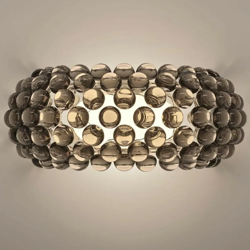 Mit ein wenig Fantasie erkennt man schon beim ersten Hinsehen, worin die beiden Designerinnen ihre Inspiration für die Caboche Plus Media Wandleuchte fanden: Sie kann nämlich ihre Ähnlichkeit mit einem Schmuckstück aus Perlen nicht verleugnen. Dafür sorgen unzählige kleine Kügelchen aus Glas, die an der Außenseite des Leuchtenschirms angebracht sind. Die Perlen aus mundgeblasenem Glas brechen das Licht und malen spannende Lichteffekte an die Wand und an die Decke. Montiert sind sie mit einem innovativen Twist-Lock-System, das den Befestigungspunkt verschwinden lässt. Somit sieht es so aus, als ob die Glasperlen frei schweben würden. Der durchsichtige Leuchtenschirm besteht aus PMMA, darin verbergen sich zwei Platten aus pulverbeschichtetem Aluminium.