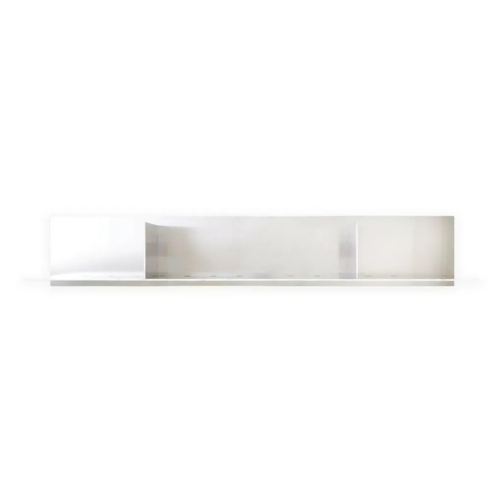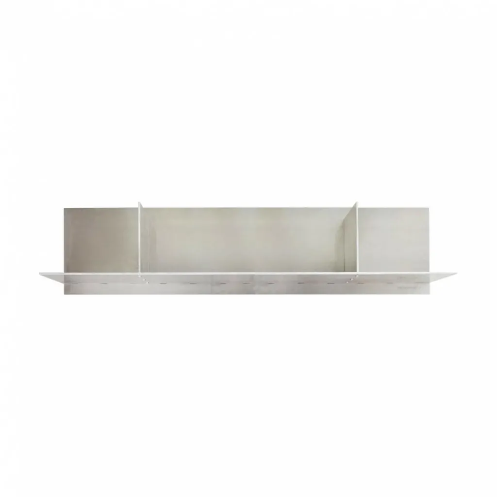 Das offen gestaltete Rivet Wandregal bietet Platz für dekorative Utensilien. Es ist in zwei Längen erhältlich: 87,6 cm und 119 cm. Beide Varianten sind 24,4 cm breit und 20,6 cm hoch. Sie haben jeweils zwei Trennwände, die das Regal in Fächer unterteilen und gut als Stützen für Bücher verwendet werden können.