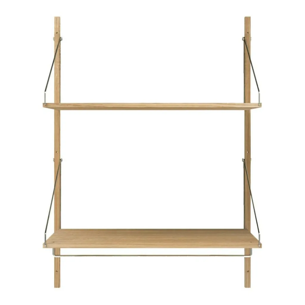 Das Shelf Library Wandregal H 114,8cm ist vielseitig einsetzbar und eignet sich nicht nur wie der Name schon sagt für die Bibliothek. Vielmehr bietet es im Wohnzimmer eine Abstellfläche für Dekorationsartikel, im Kinderzimmer schafft es Stauraum für Spielzeug und im Büro können Order und Dokumente ordentlich abgelegt werden. Das Design unterscheidet sich merklich von traditionellen Regalsystemen: Das Gestell besteht nämlich nur aus zwei Eichenholzleisten. Damit das Shelf Library Wandregal H 114,8cm nicht nach vorne kippt, wird es mit den mitgelieferten Schrauben an der Wand befestigt. Die Regalbretter werden mit schlichten Halterungen aus Edelstahl an den beiden Leisten befestigt. Da an den Leisten zahlreiche Löcher für die Montage vorgebohrt sind, können sie in der gewünschten Höhe montiert werden.