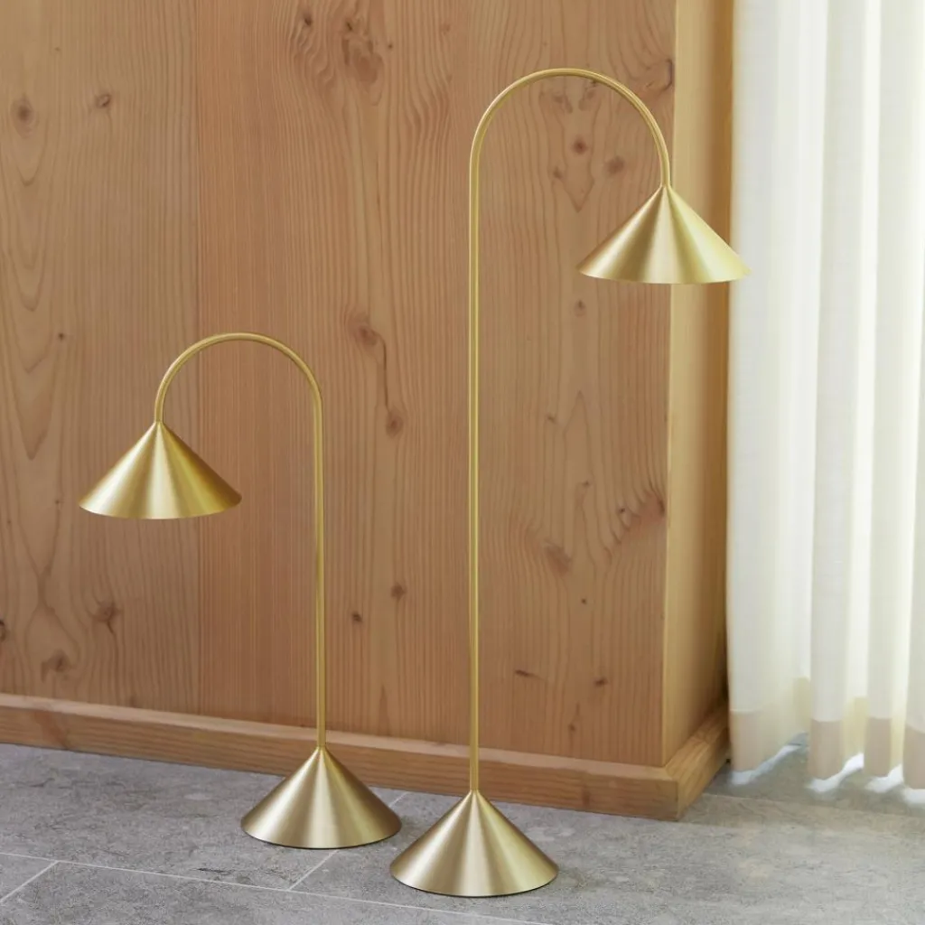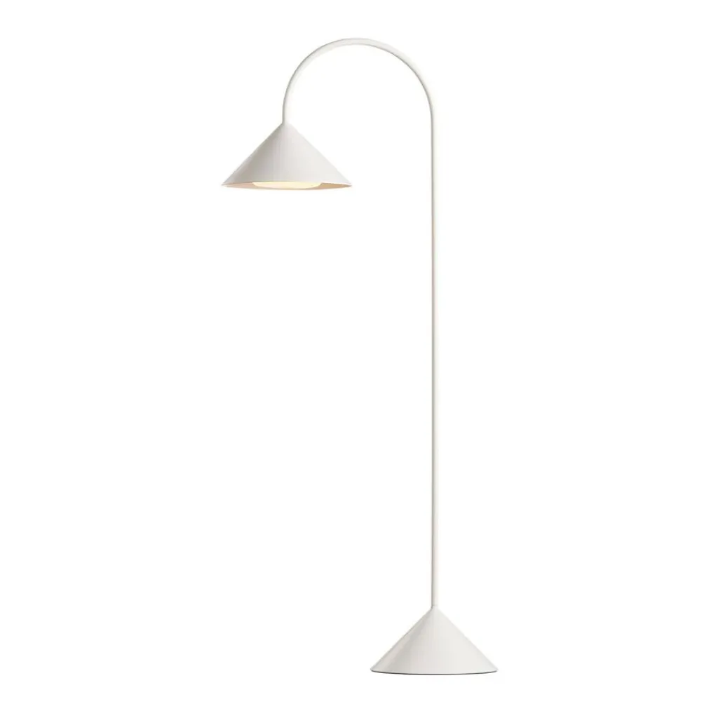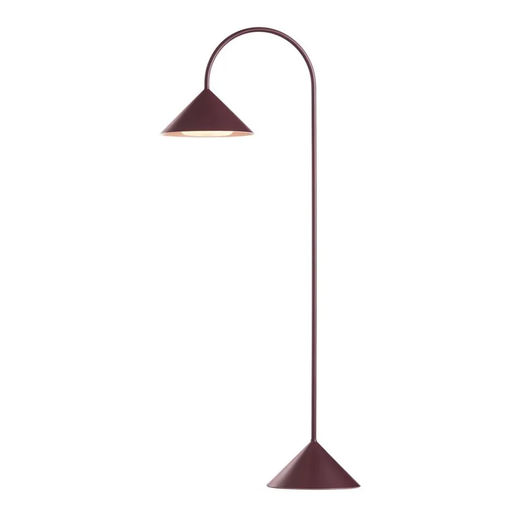 Zwei identisch kegelförmige Elemente bilden bei der Grasp LED Akkuleuchte tragbar H 72cm den Sockel und den Leuchtenschirm. Beide werden von einem stangenförmigen Leuchtenständer verbunden. Seine halbrunde Biegung dient als namensgebender Griff der portablen Leuchte. Bei der integrierten LED handelt es sich um die spezielle Frandsen-ONE-Lichtquelle. Sie hat eine Betriebszeit von 12 Stunden und strahlt ihr 2700K warmweißes Licht mit einem breiten Lichtkegel direkt nach unten. Zur Aufladung mittels SELV-Ladegerät wird die Lichtquelle einfach aus dem Leuchtenschirm genommen. Die Leuchte misst 72cm Höhe bei 32,5cm Tiefe und einem Durchmesser von 15cm. Das Gewicht beträgt 3,08kg. Es gibt sie in verschiedenen Farben und wahlweise aus matt pulverbeschichtetem Edelstahl oder Messing.