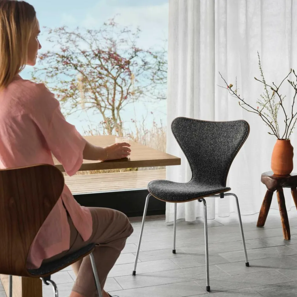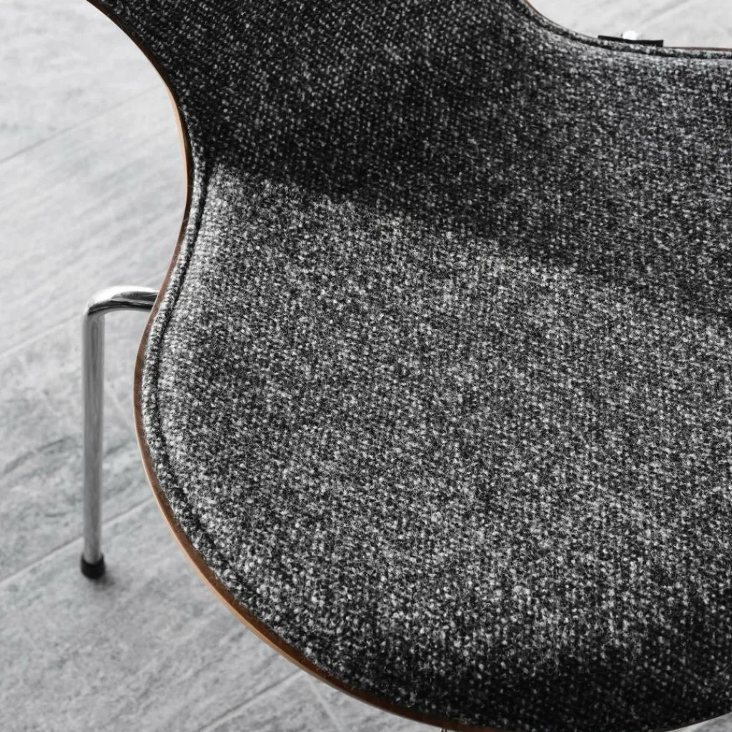 In den Werken von Charles und Ray Eames fand Jacobsen seine Inspiration für den Jubiläumsedition 2022 Serie 7™ Stuhl.Von ihnen übernahm er die Kunst, Schichtholz in gebogene Linien zu bringen. Ein weiterer Anspruch Jacobsens war, einen kostengünstigen und einfachen Stuhl zu entwerfen. So beschränkt sich der Jubiläumsedition 2022 Serie 7™ Stuhl auf eine Sitzschale, die ohne Kanten auskommt. Die Sitzfläche ist rund geformt und vorn ein wenig über das Gestell gezogen. Die Sitzschale ist aus neun Schichten Furnier zusammengesetzt. Wasserbasierter Kleber hält sie zusammen. Über dem Kern ist eine Schaumschicht montiert. Der Jubiläumsedition 2022 Serie 7™ Stuhl ist mit Stoff der bekannten dänischen Marke Kvadrat bezogen. Er besteht zu 92 Prozent aus Schurwolle und zu 8 Prozent aus Nylon. Einen interessanten Kontrast zur markant taillierten Sitzschale bilden die vier leicht ausgestellten Beine aus 14 mm dickem Stahlrohr mit Kunststoffgleitern.
