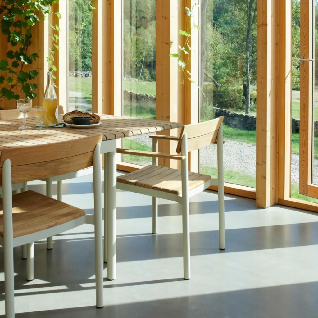 Der Skagerak Pelagus Gartenarmlehnstuhl von Fritz Hansen, entworfen vom Note Design Studio, verbindet minimalistisches Design mit hochwertigen Materialien.