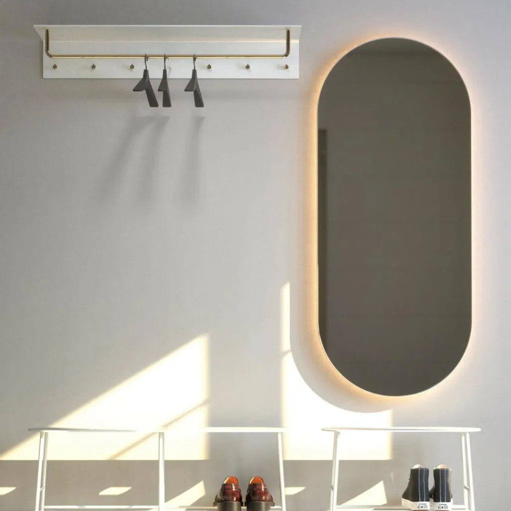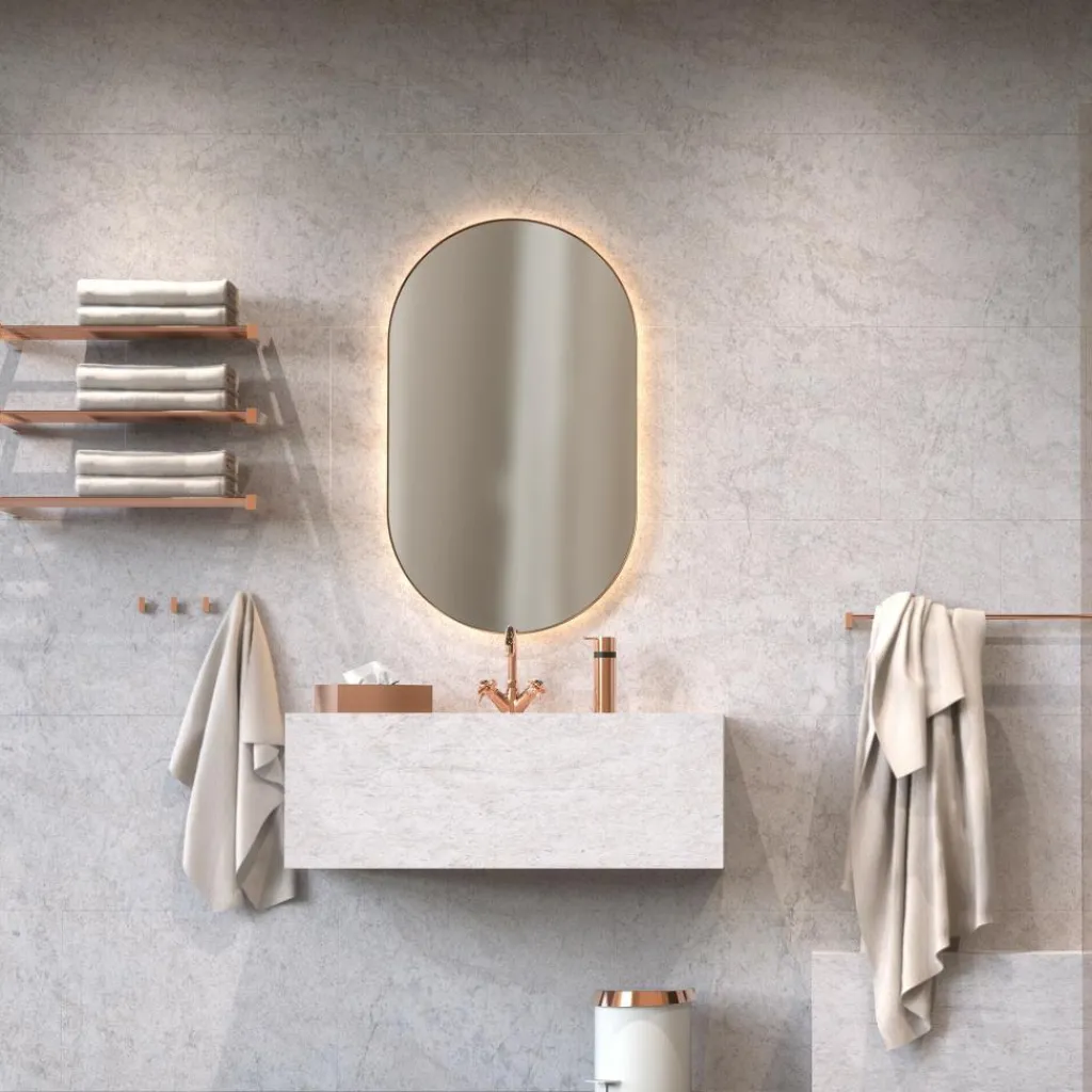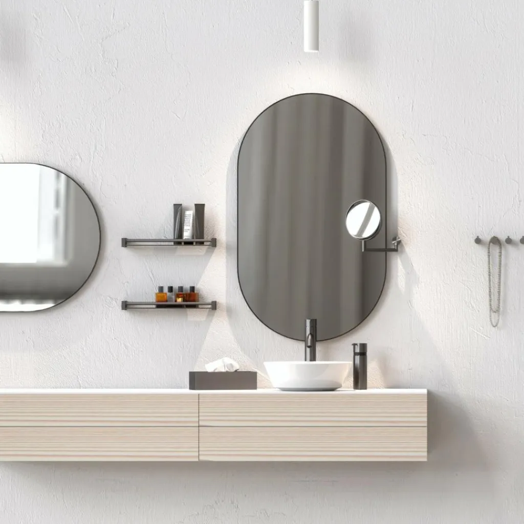 Egal ob im Bade- oder Schlafzimmer oder im Vorraum, der Unu 4145 Wandspiegel mit Rahmen 60x100cm verbreitet überall elegantes Flair. Dafür sorgt der filigrane Rahmen, der wahlweise aus mattem Aluminium oder gebürstetem Edelstahl besteht. Der Rahmen bildet eine deutliche Kante, die ein wenig nach vorne steht. Darin werden Lichtstrahlen auf faszinierende Weise reflektiert. Bestellbar ist der Unu 4145 Wandspiegel mit Rahmen 60x100cm in unterschiedlichen Rahmenfarben. Da er waagerecht oder senkrecht montiert werden kann, lässt der Unu 4145 Wandspiegel mit Rahmen 60x100cm Flexibilität bei der Platzierung zu. Die Montage erfolgt mit jeweils zwei Dübeln und Schrauben, die im Lieferumfang enthalten sind. Die Dübel haben einen Durchmesser von 8mm und sind 4cm lang. Die gleich langen Schrauben haben einen Durchmesser von 5mm. Das ovale Spiegelglas lässt sich mit einem milden Glasreiniger und einem weichen Mikrofasertuch von Staub und Schmutz befreien.
