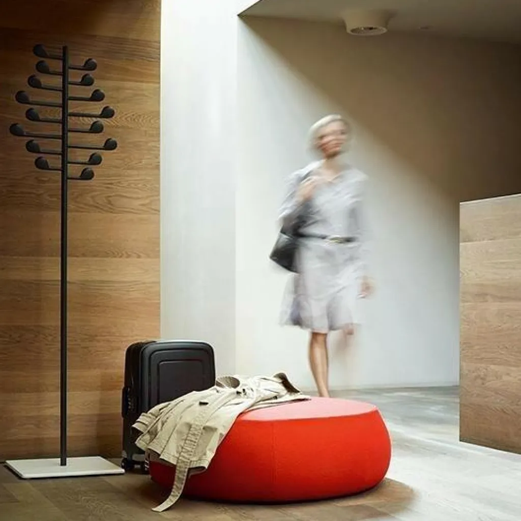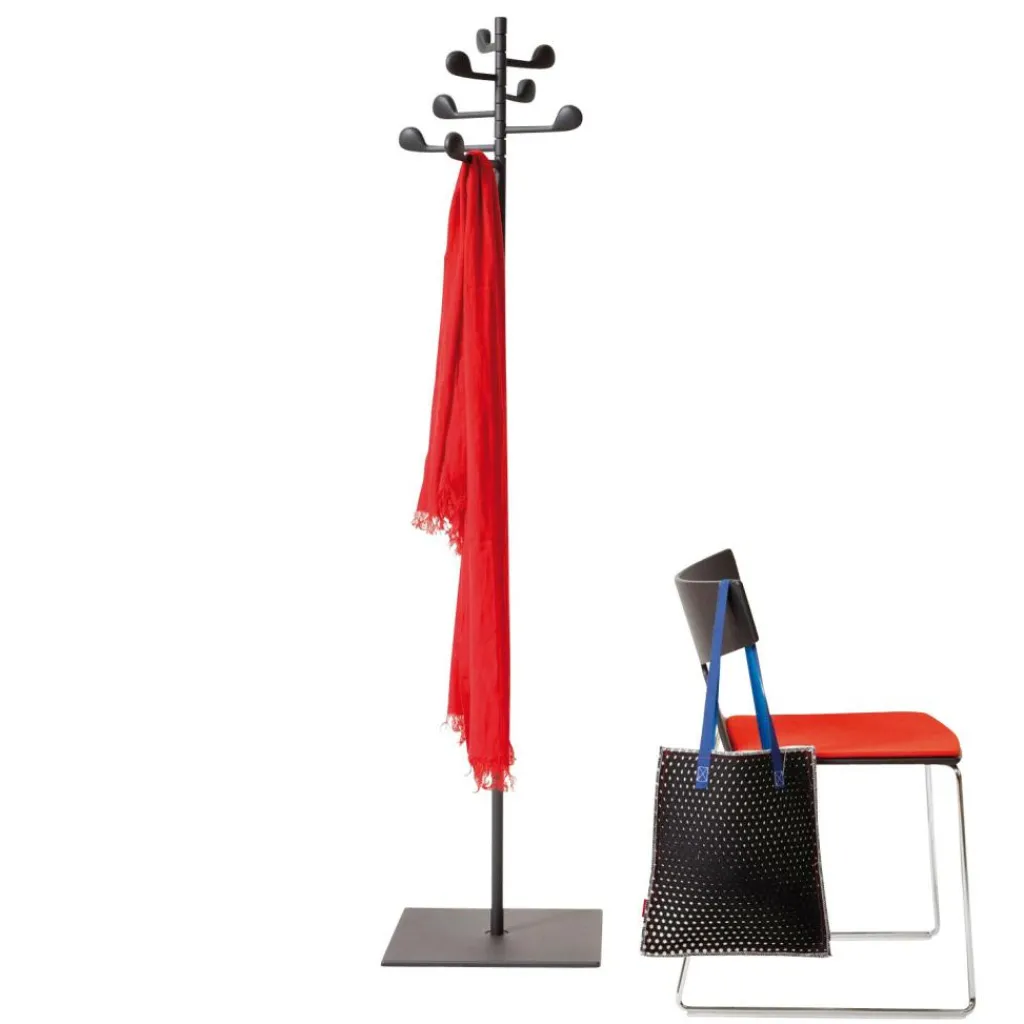 Arper hat mit diesem Produkt einen platzsparenden Garderobenständer auf den Markt gebracht, der dank seiner quadratischen Bodenplatte einiges an Gewicht tragen kann. Die Bodenplatte wird aus Holz gefertigt und ist in unterschiedlichen Farben erhältlich. Der restliche Ständer wird aus Stahl und Aluminium hergestellt und erscheint immer in der Farbe Anthrazit. Der Garderobenständer erreicht eine Gesamthöhe von 177,5 cm und die viereckige Platte misst 43 x 43 cm. Die durch die gewählten Farben kreierte elegante Erscheinung lässt den Einsatz in jedem Raum zu, gleichgültig, in welchem Einrichtungsstil dieser Raum gestaltet ist oder für welchen Zweck er genutzt wird. Überall dort, wo eine platzsparende Aufbewahrung von Kleidungsstücken erforderlich ist, kann dieser Garderobenständer zum Einsatz kommen.