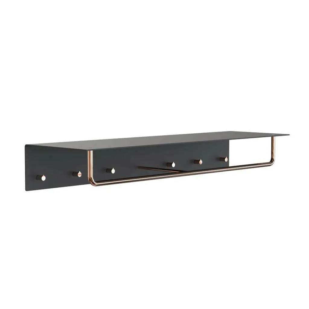 Die Unu Wandgarderobe mit 6 Haken & Stange erhalten Sie in verschiedenen Farbvarianten. Bestellen Sie strahlendes Weiß in Kombination mit Silber oder Kupfer. Für stärkere Kontraste sorgen die schwarzen Ausführungen. Auch hier können Sie zwischen silberfarbenen und kupfergetönten Akzenten wählen. Die formschöne Garderobe ist 15 cm hoch und 30 cm tief. Sie hat eine Breite von 100 cm. Unter der Stange für die Kleiderbügel befinden sich sechs kleine Haken für Jacken oder Taschen. Die Kleiderablage wird von verdeckten Befestigungselementen an der Wand gehalten.