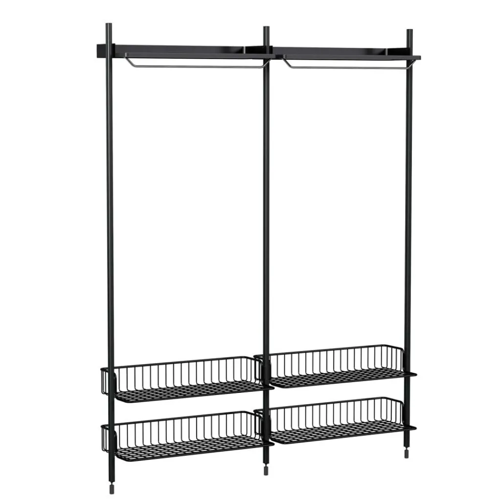 Ein klassischer Stahlrohrrahmen bildet die Basis für die Pier System 1012 Garderobe.An der Unterseite sind Plastikkappen und verstellbare Gleiter angebracht. An der Oberkante schließt das Modell mit zwei Kleiderstangen ab. Sie bieten viel Platz, um Kleidungsstücke ordentlich aufzubewahren. Im Lieferumfang der Pier System 1012 Garderobe sind des Weiteren vier halb offene Körbe enthalten. Sie bestehen aus Gitter, die aus Aluminium gefertigt werden. Jeder dieser Körbe kann mit bis zu 15 kg Gewicht gefüllt werden. Handschuhe, Mützen und vieles mehr wird hier griffbereit aufbewahrt. Eine Pulverbeschichtung sorgt dafür, dass die Pier System 1012 Garderobe lange Zeit wie neu aussieht.