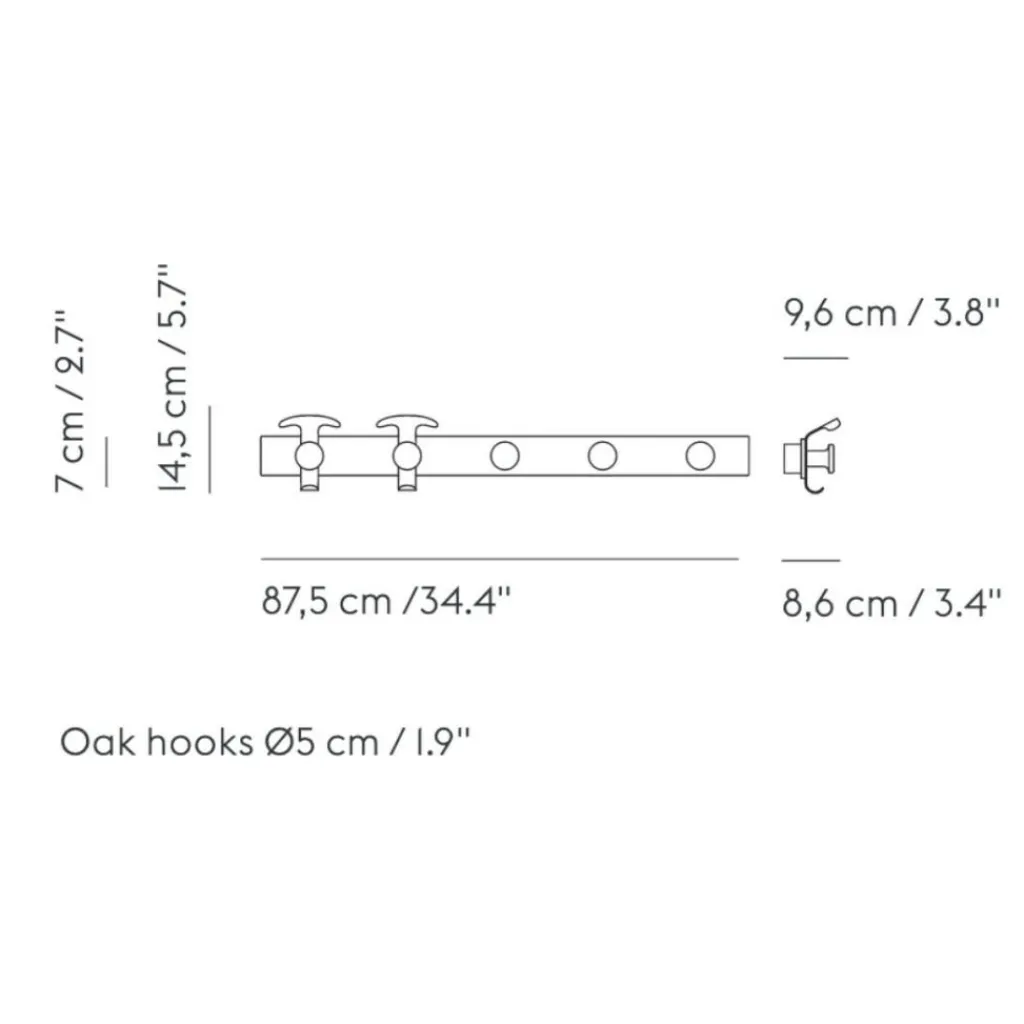 Die Avail Wandgarderobe ist auf einem schmalen Plateau montiert, das einen kleinen Abstand zur Wand fixiert. Sie haben die Möglichkeit, die Garderobe im Eingangsbereich Ihres Zuhauses oder Ihrer Kanzlei zu befestigen. Alternativ dazu nutzen Sie die Garderobe als Blickfang im Schlaf- oder Ankleidezimmer, wo Taschen, Tücher und Hüte aufbewahrt werden können.