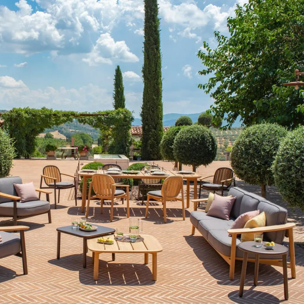 Der Twins Beistelltisch niedrig 85x85cm ist im schlichten Stil gestaltet. Er steht sicher auf vier geraden Beinen. Die Tischplatte weist deutliche Lücken auf. Durch sie kann Regenwasser rasch abfließen. Die Ecken der Tischplatte sind abgerundet. Hergestellt ist der Twins Beistelltisch niedrig 85x85cm aus Teakholz. Es handelt sich um ein bewährtes Material, das sich mit Witterungsbeständigkeit auszeichnet. Allerdings zeigt sich eine Patina, wenn der Tisch Wind und Wetter ausgesetzt ist. Um das zu verhindern, zahlt sich regelmäßige Pflege aus. Der Twins Beistelltisch niedrig 85x85cm ist mit dem FSC®-Siegel ausgezeichnet. Das bedeutet, dass das Material aus nachhaltiger Forstwirtschaft stammt. Der Twins Beistelltisch niedrig 85x85cm strahlt natürliches und warmes Flair aus.