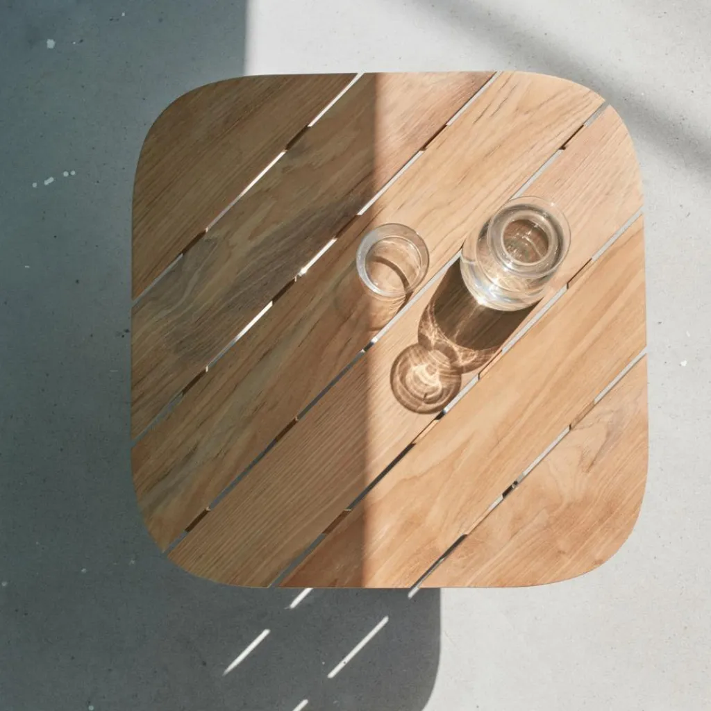 Der Lilium Lounge Gartenbeistelltisch schafft mit schlichten Linien und rustikal anmutenden Elementen einen eleganten Gesamteindruck. Die Paneele der Tischplatte sind diagonal zur Form des Grundgestells angeordnet und lockern die quadratische Form dadurch auf. Verwendet wurde tropisches Teakholz aus kontrollierten Anbaugebieten. Da Teak widerstandsfähig gegen alle Witterungseinflüsse ist, kann der Beistelltisch bei Regen und bei schlechtem Wetter draußen verbleiben. Das Holz ist unbehandelt und kann nach einiger Zeit eine silbergraue Färbung annehmen. Um den natürlichen Farbton zu erhalten, können Sie jedoch die Oberfläche zu Beginn der Outdoor-Saison mit einem geeigneten Holzöl behandeln. Das Untergestell wurde aus korrosionsbeständigem Edelstahl gefertigt, der keinerlei Pflege benötigt und im Bedarfsfall feucht abgewischt werden kann. Mit einer Fläche von 60 x 60 cm hat der Lilium Lounge Gartenbeistelltisch ein großzügiges Platzangebot. Durch die geringe Höhe von nur 50 cm bietet Ihnen der Beistelltisch auch neben einer Gartenliege oder einem Lounge Chair eine praktische Abstellfläche für Getränke und Snacks.