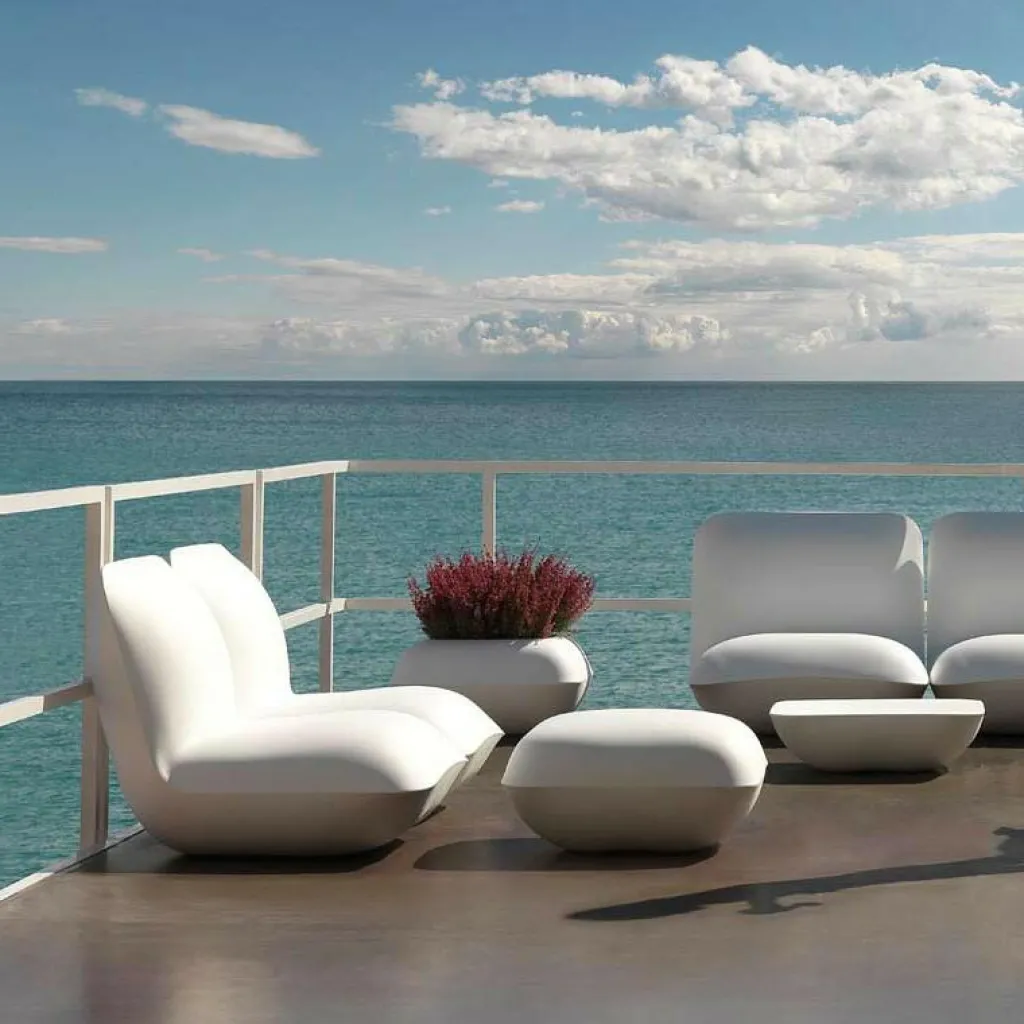 Der Pillow Gartenbeistelltisch wurde von Stephano Giovanoni für die Marke Vondom entworfen. Er fügt sich harmonisch in das Pillow-Outdoor-Ensemble ein, das seine Bezeichnung den Formen verdankt, die von gemütlichen Kissen inspiriert sind.