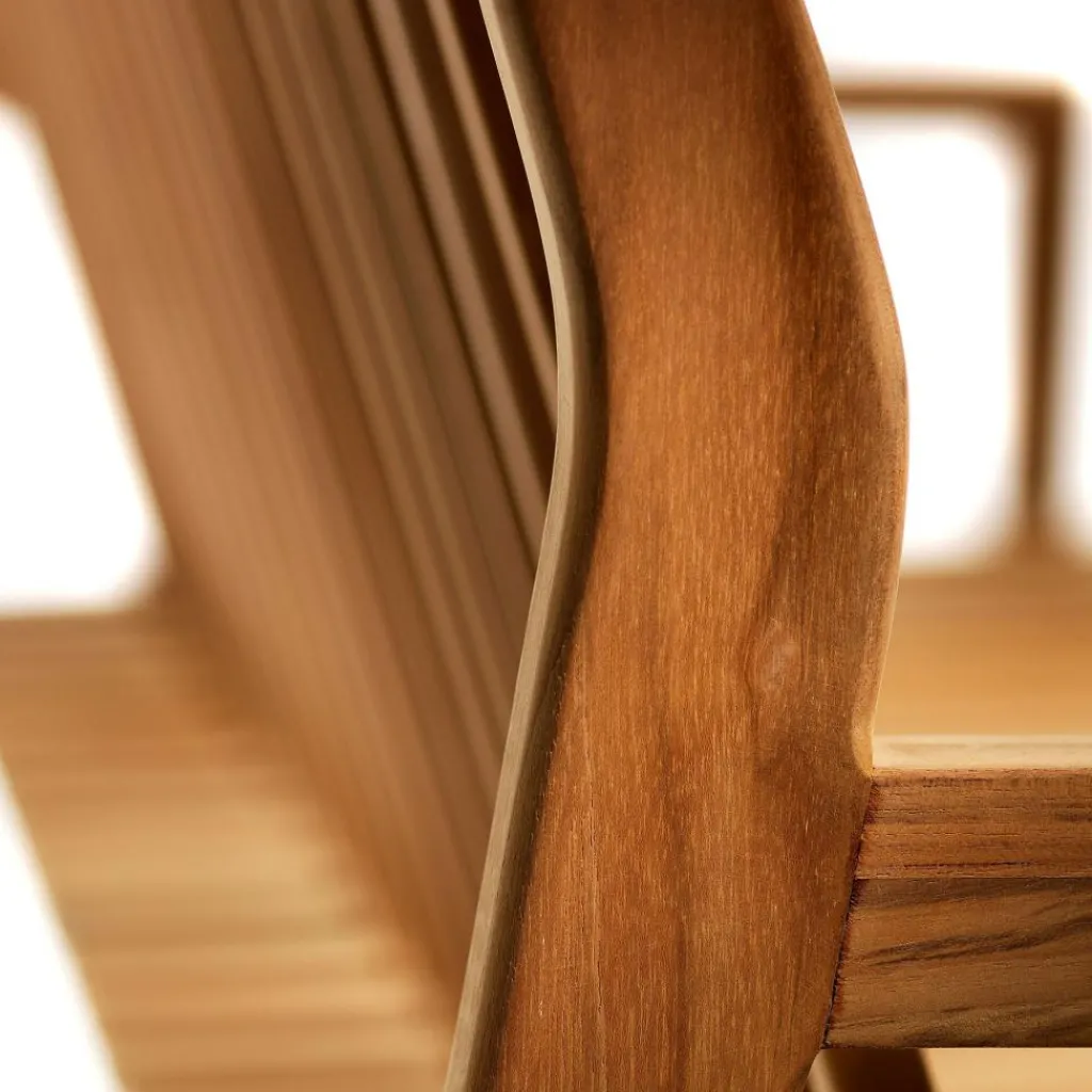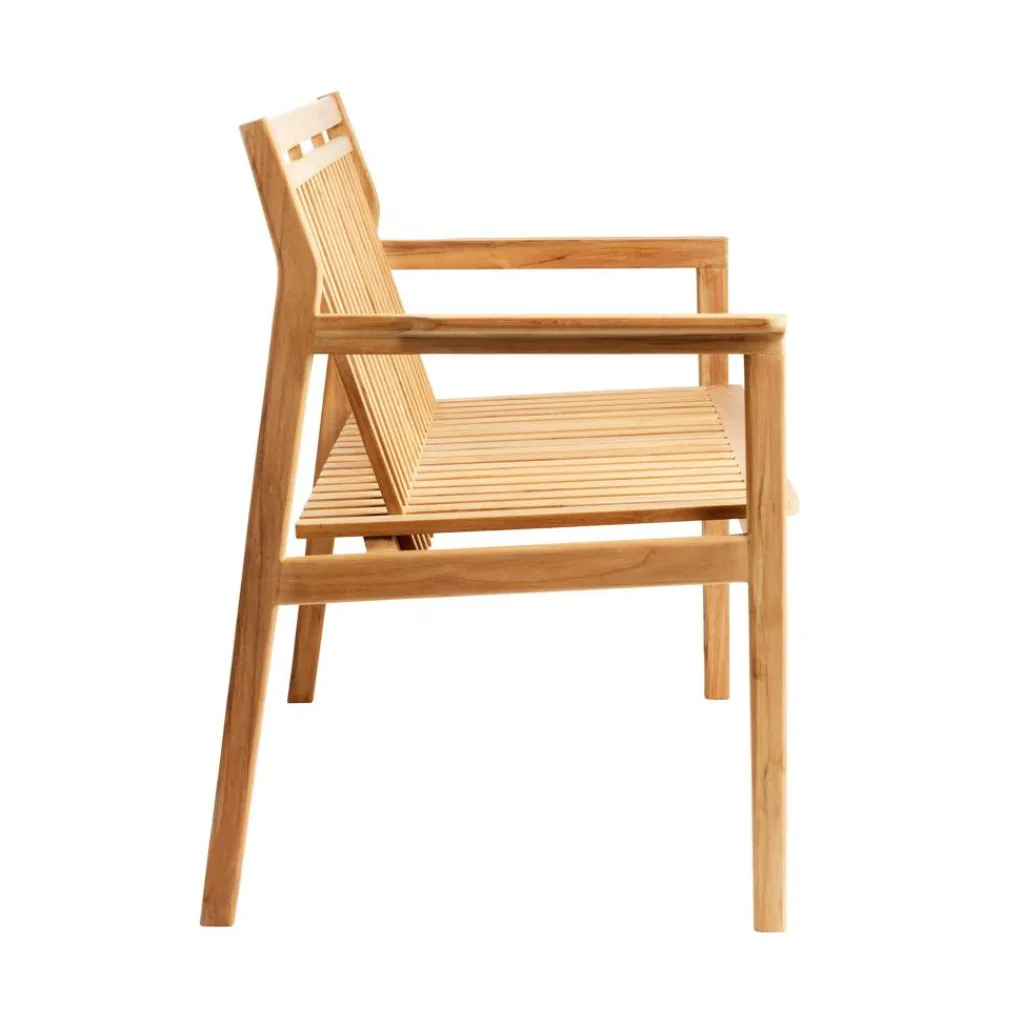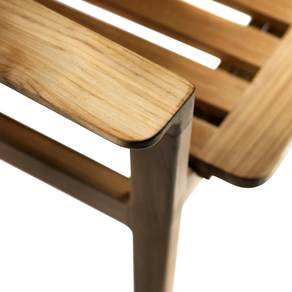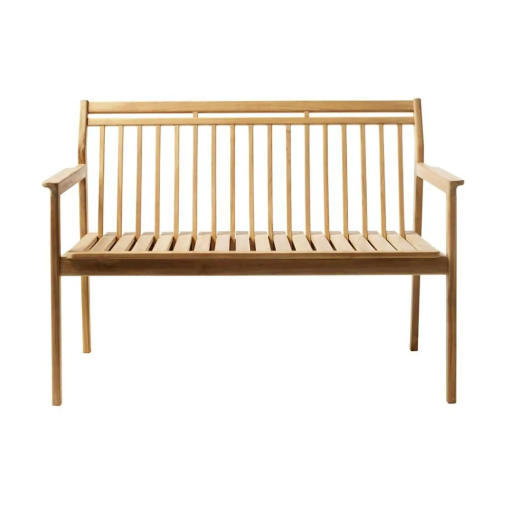 Die Sitzfläche der M12 Sammen Gartenbank mit Rückenlehne 2-Sitzer ist, wie man es von traditionellen Bänken gewohnt ist, aus Lamellen zusammengesetzt. Die Rückenlehne besteht aus schlanken Stäben, die genau in die Spalten zwischen den Lamellen der Sitzfläche eingepasst sind. Gemeinsam mit den beiden eckig geformten Armlehnen und den hinten leicht ausgestellten Beinen ergibt sich ein harmonisches Gesamtbild. Die M12 Sammen Gartenbank mit Rückenlehne 2-Sitzer hat eine schöne, goldene Farbe. Damit sie erhalten bleibt, muss das Möbelstück im Jahr zweimal geölt werden. Die Bank besteht aus Teakholz, einem witterungsbeständigen Naturmaterial. Die M12 Sammen Gartenbank mit Rückenlehne 2-Sitzer ist eine nachhaltige Wahl: Das Holz stammt nämlich aus verantwortungsbewusster Forstwirtschaft. Das attestiert das FSC®-Siegel.