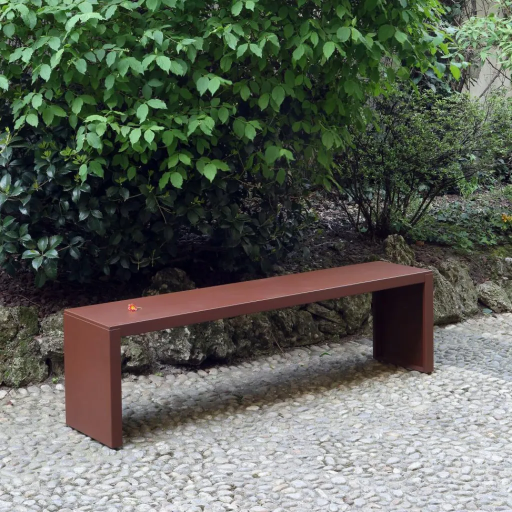 Eine Epoxylackierung macht die Oberfläche der Big Irony Outdoor Bank widerstandsfähig gegen Witterungseinflüsse. Es wird empfohlen, die Bank im Winter abzudecken, wenn sie im Freien steht. Nach einem Regenguss kann sie mit einem weichen Tuch abgewischt werden und ist rasch wieder einsatzbereit. Die Big Irony Outdoor Bank wird aus Stahlblech gemacht. Klare Linien definieren die schlichte Bank. Auf zwei vertikalen Seitenplatten mit eingefalteten Kanten ist die Sitzfläche befestigt. Bei der Big Irony Outdoor Bank handelt es sich um ein robustes Möbelstück, das vielen Generationen Freude bereitet. Sollte die Bank das Ende ihres Lebenszyklus erreicht haben, kann sie vollständig verwertet werden. Jede Bank entsteht in Qualitätshandarbeit und daher ein Unikat.