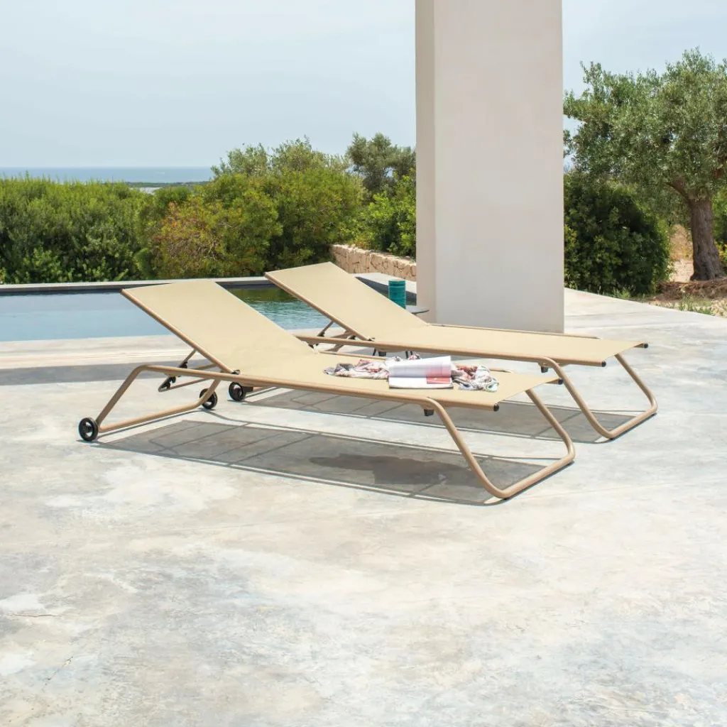Die Liege ist mit dem speziell vom italienischen Gartenmöbelspezialisten entwickeltem Kunststoffgewebe Polyvinyl und Polyester bespannt. Das Gewebe ist All-Wetter tauglich robust und UV-Beständig. Weiterhin ist das Material gegen Temperaturschwankungen resistent. Es ist somit kein Problem, diese Liege auch nachts draußen stehen zu lassen. Das Gestell ist aus pulverbeschichtetem Stahlrohr. Die Kopfstütze der Snooze Sonnenliege lässt sich leicht durch feste Einrastpunkte verstellen. Somit lässt sich die Kopfstütze für jeden Benutzer auf die individuelle Position einstellen. An der Kopfseite angebrachte Räder erleichtern das Umsetzen der Liege. Der Positionswechsel von Sonne in den Schatten ist somit schnell vollzogen. Die Liege besitzt die Abmessungen von Höhe: 37 cm, Breite 92 cm und eine Länge von 215 cm. Bei aufgestellter Rückenlehne beträgt die Höhe 102 cm. Ausgelegt ist die Liege für eine maximale Tragkraft von 200 kg.