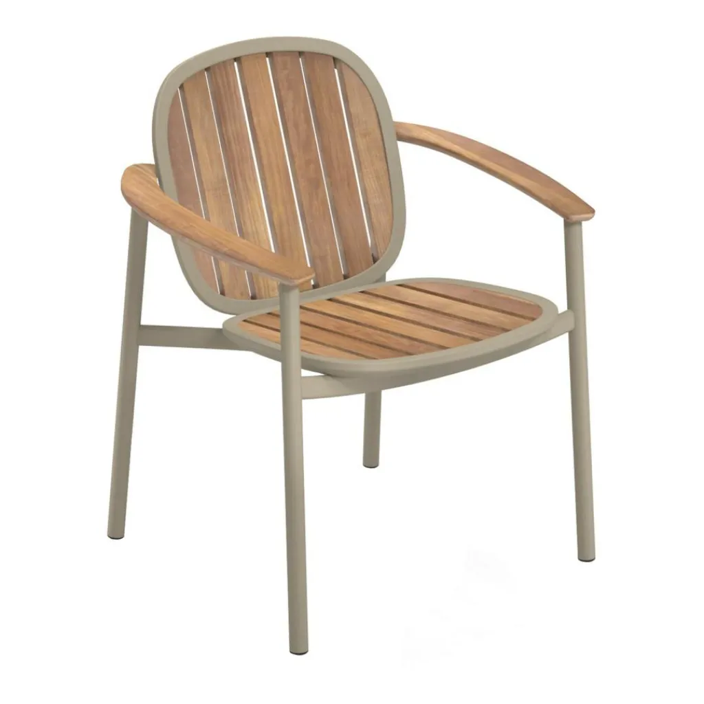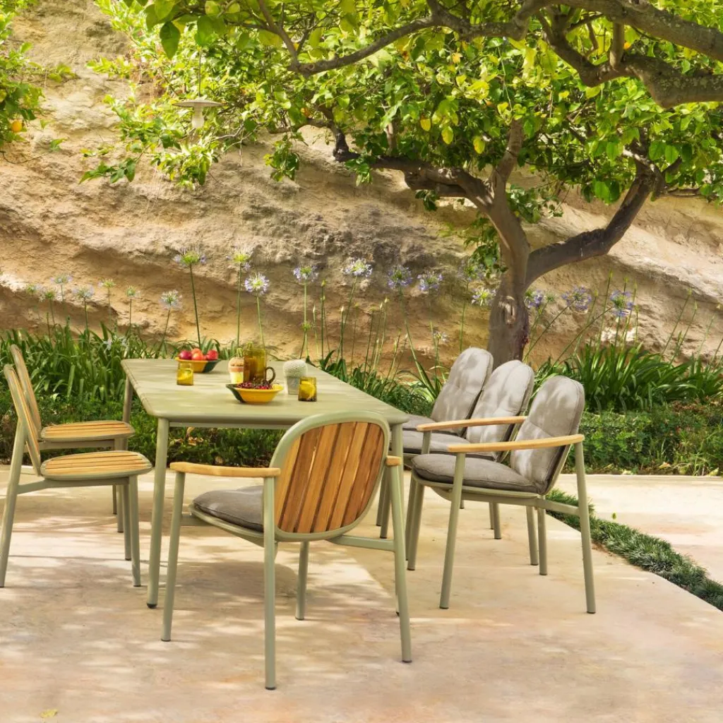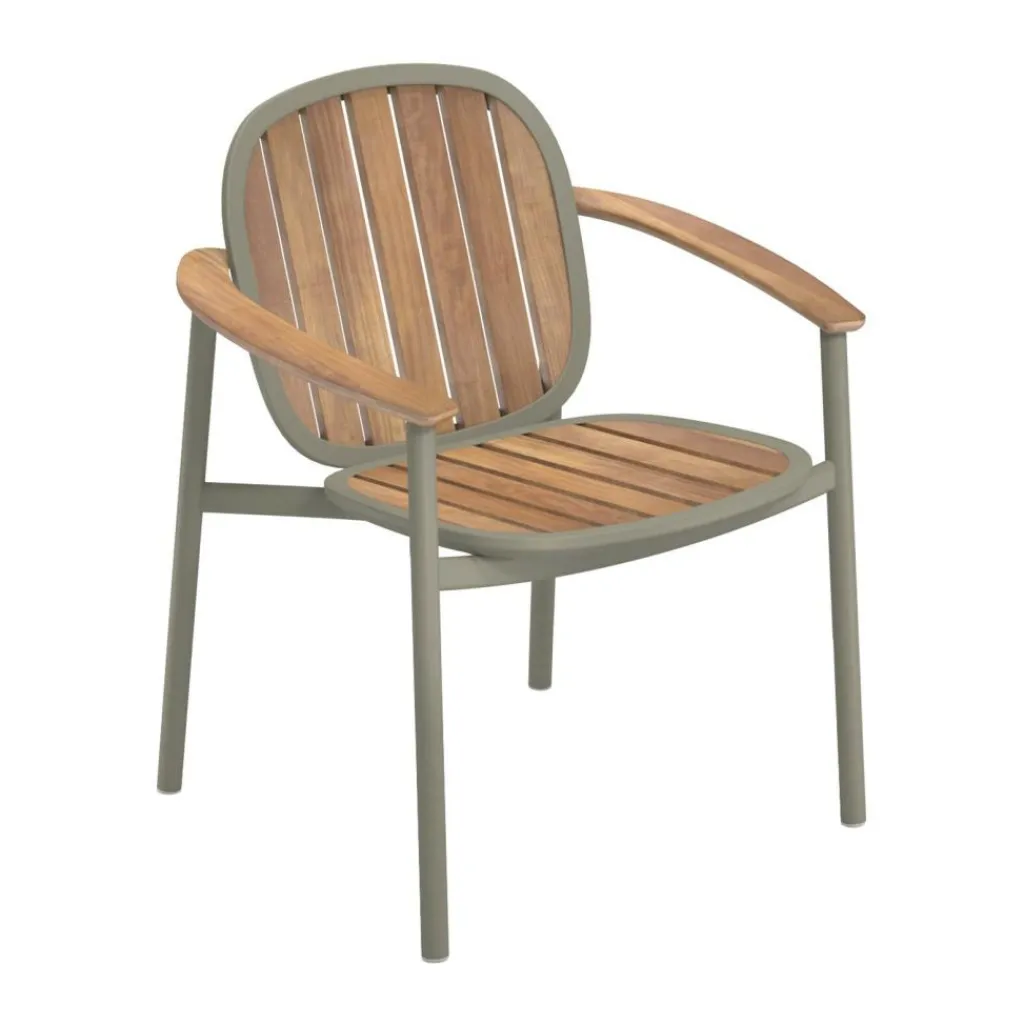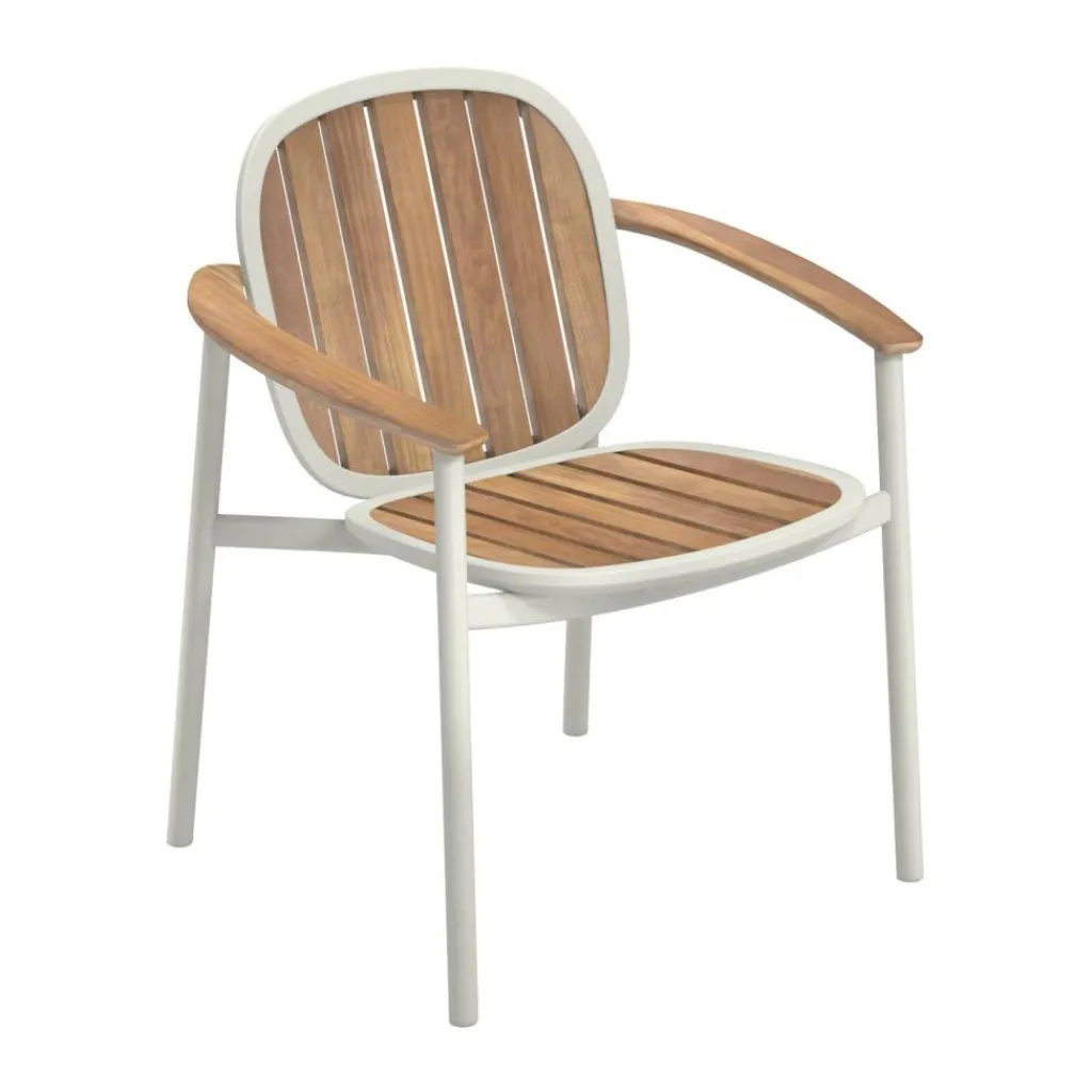 Der Twins Gartenarmlehnstuhl wird aus Aluminium und Teak gemacht. Eine Symbiose wie bei Zwillingen findet der Designer. Daher gibt er der Kollektion den englischen Namen für Zwillinge. Das Gestell wird aus robustem Aluminiumrohr gemacht. Die Oberfläche ist pulverbeschichtet. So kann man den Twins Gartenarmlehnstuhl in unterschiedlichen Gestellfarben bestellen. Die Armlehnen, die Rückenlehne und die Sitzfläche sind aus Teakholz gemacht. Der Werkstoff trägt das FSC®-Siegel. Es sagt aus, dass sich bei der Waldbewirtschaftung Abholzung und Aufforstung die Waage halten. Die Sitzfläche und die Rückenlehne haben Zwischenräume. Wenn es regnet, fließt die Nässe ab. Das Teakholz verändert seine Farbe, wenn es nicht mit einem geeigneten Pflegemittel behandelt wird.