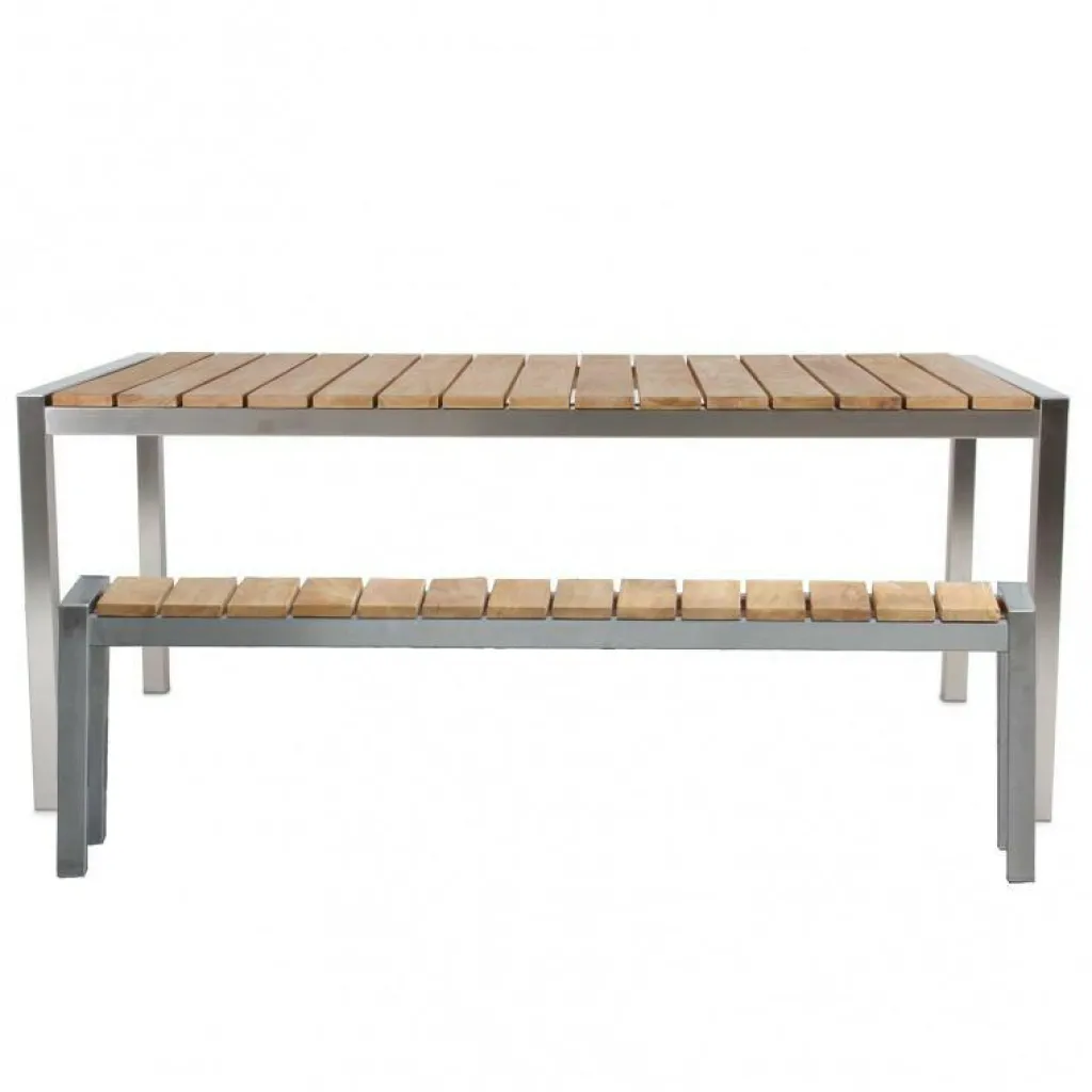 Das vorliegende Luxury Gartenset macht seinem Namen alle Ehre: Es ist aus robustem, geschliffenem Edelstahl und natürlichem Teakholz gefertigt und setzt sich aus einem Tisch und einer dazu passenden Sitzbank zusammen. Das Holz ist mit dem „Trees 4 Trees“-Zertifikat ausgestattet. Die Stahlbeine beider Möbel besitzen eine Stärke von 5cm und machen einen gediegenen Eindruck. Beide Möbelstücke weisen die Länge von 180cm auf. Der Tisch ist 75cm hoch und 90cm breit. Das elegante Luxury Gartenset ist wetterfest und damit perfekt für den Gebrauch auf der Terrasse oder im eigenen Garten geeignet. Selbstverständlich können Sie das Set auch im Innenbereich einsetzen. Auf jeden Fall können bequem bis zu drei Personen auf der Bank Platz nehmen, sodass Sie Ihre Gäste bei der kommenden Gartenparty mit einem zeitlos klassischen Design Ihrer neuen Gartenausstattung überraschen können.