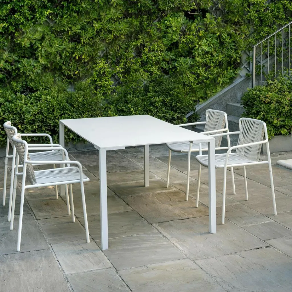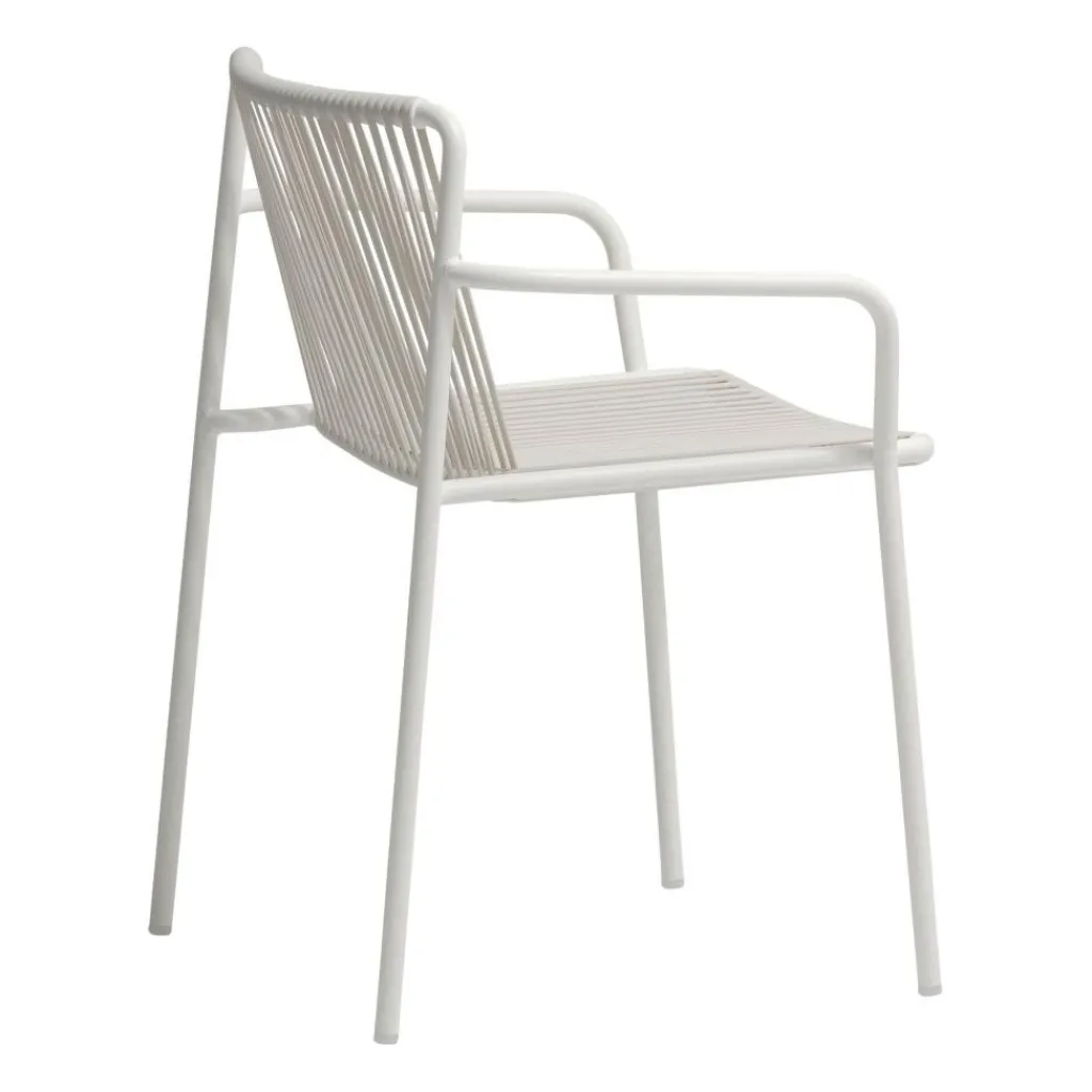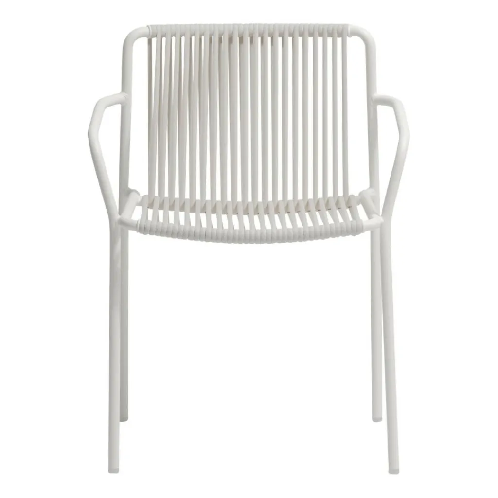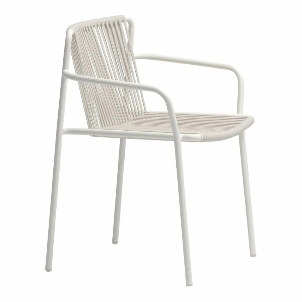 Der Tribeca 3665 Gartenarmlehnstuhl wurde von Simone Mandelli und Antonio Pagliarulo für den Hersteller Pedrali entworfen. Eine Hommage an die Sixties stellt dieser charaktervolle Armlehnstuhl dar, der in seiner modernen Neuinterpretation schwungvolle Schönheit mit den Anforderungen des dritten Jahrtausends kombiniert. Die Anlehnung an die Zeit der verchromten Riesenschlitten und der versteckten Erotik à la Marilyn Monroe findet sich auch in den Details des Tribeca 3665 Gartenarmlehnstuhls wieder. Die Neuauflage der klassischen Terrassenstühle der Sixties setzt auf geflochtenen Stahl. Das Gestell wird traditionell aus Stahlrohr gefertigt und für den Außenbereich wetterfest lackiert. Eine klassische Note erreicht der Stuhl auch durch die Bespannung von Rückenlehne und Sitzfläche, die aus extrudiertem PVC mit Nylonkern besteht. Natürlich ist Tribeca stapelbar.